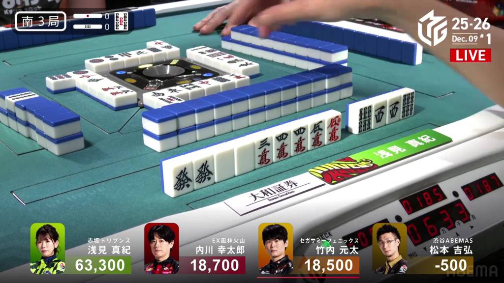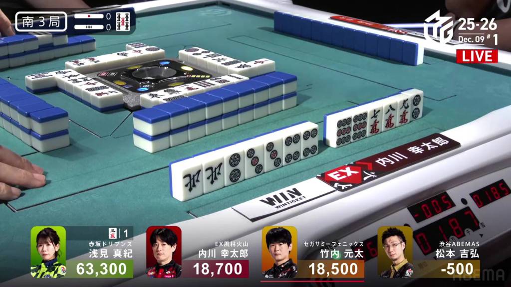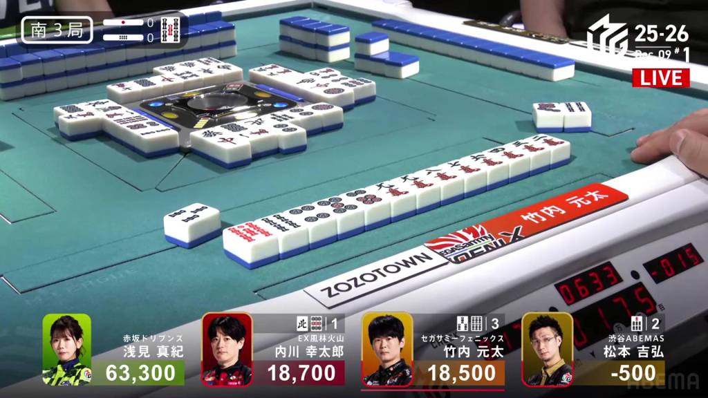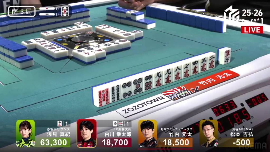 In S3-0, Genta is the dealer in 3rd place and is 200 behind 2nd place Uchikawa.