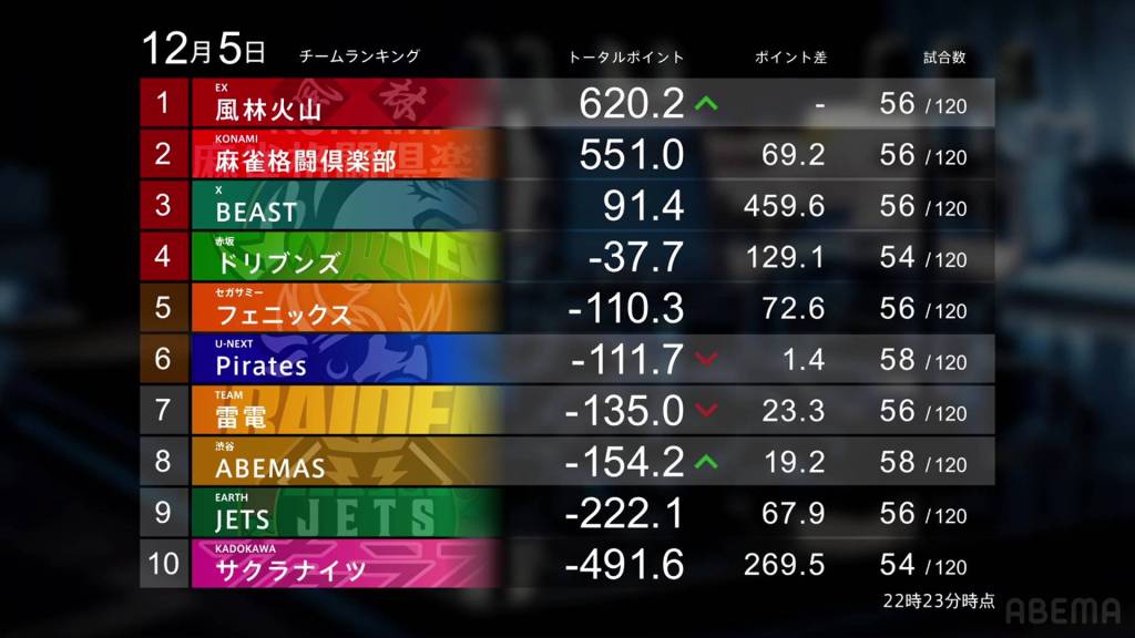 Team Raiden, Earth Jets, Konami Mahjong Fight Club, U-Next Pirates and Sega Sammy Phoenix all dropped a bit. Though Kurosawa started the team’s week off well with a 1st place, the guys ended up losing points and they ended up going down a rank to 8th place. The Earth Jets had a 2nd and 3rd filled week and leaving them down in 9th place. The Konami Fight Club struggled with two 4ths and two 3rds to start the week, but a 2nd and 1st on Friday helped to soften the blow. The U-Next Pirates were the opposite, being the best performers on Monday, but bled with three 4ths and a 3rd to end the week. And the Sega Sammy Phoenix were unable to get 1st place in any of their four games, moving them down from 5th to 7th.