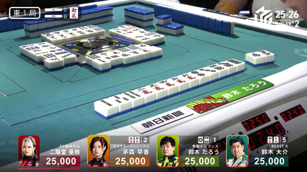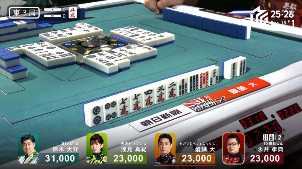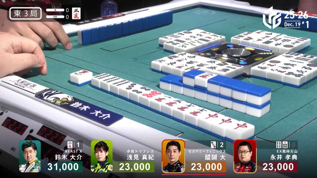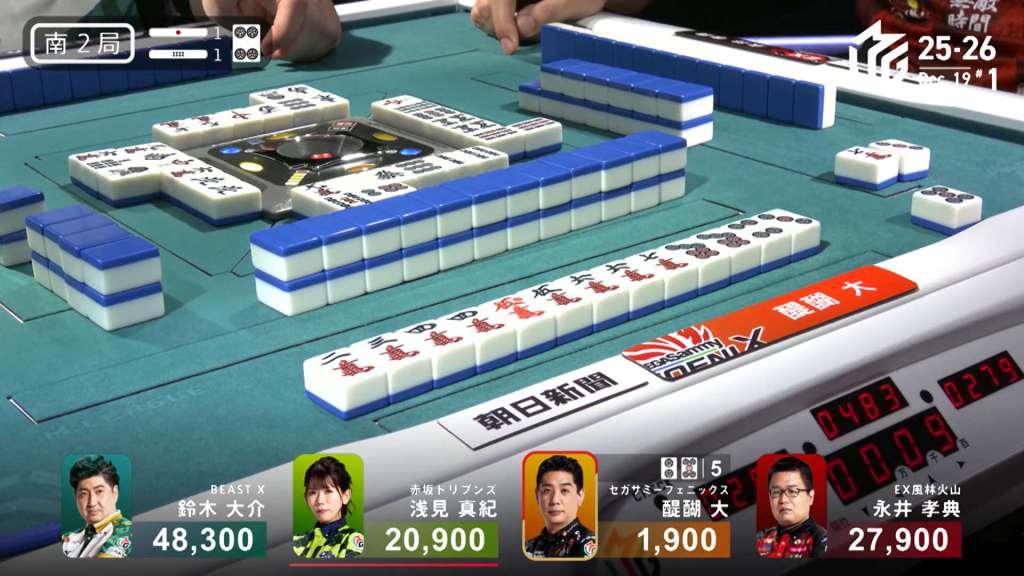 In S2-1, Daigo is in 4th place and is 19,000 behind 3rd place dealer Asami. A riichi stick and a honba are in the pot.