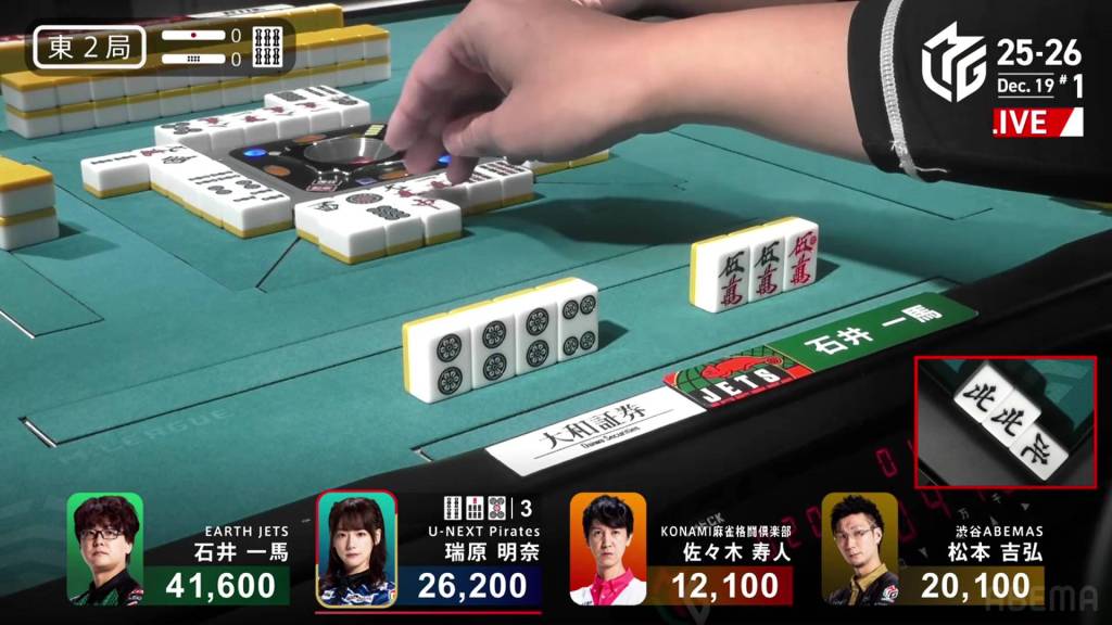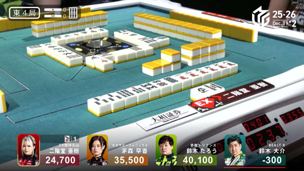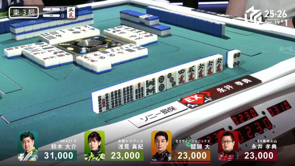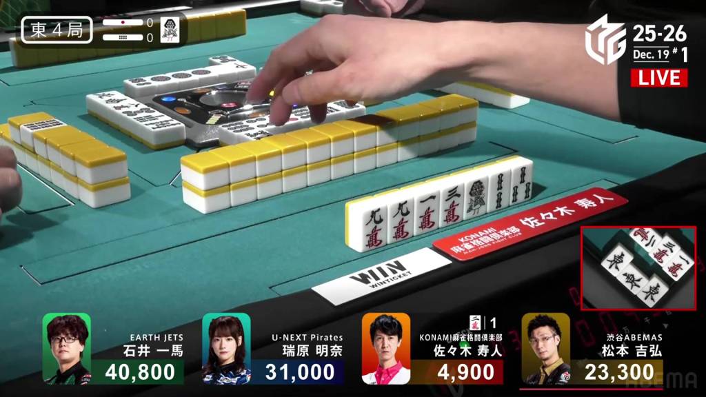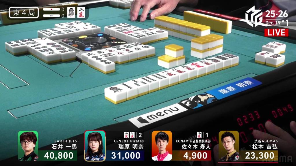 And just as quickly as it starts, it finishes. On Daigo’s next turn, he discards the 4s and deals into Nagai. Nagai wins the hand with Riichi/Ippatsu/Pinfu/Aka 1 for 12,000 plus two riichi sticks.