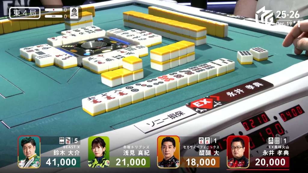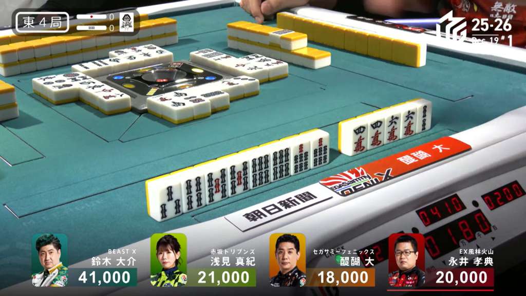 In E4-0, Nagai is the dealer in 3rd place, 1,000 behind 2nd place Asami and 21,000 behind 1st place Daisuke.