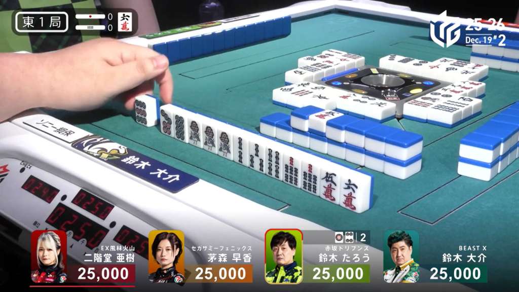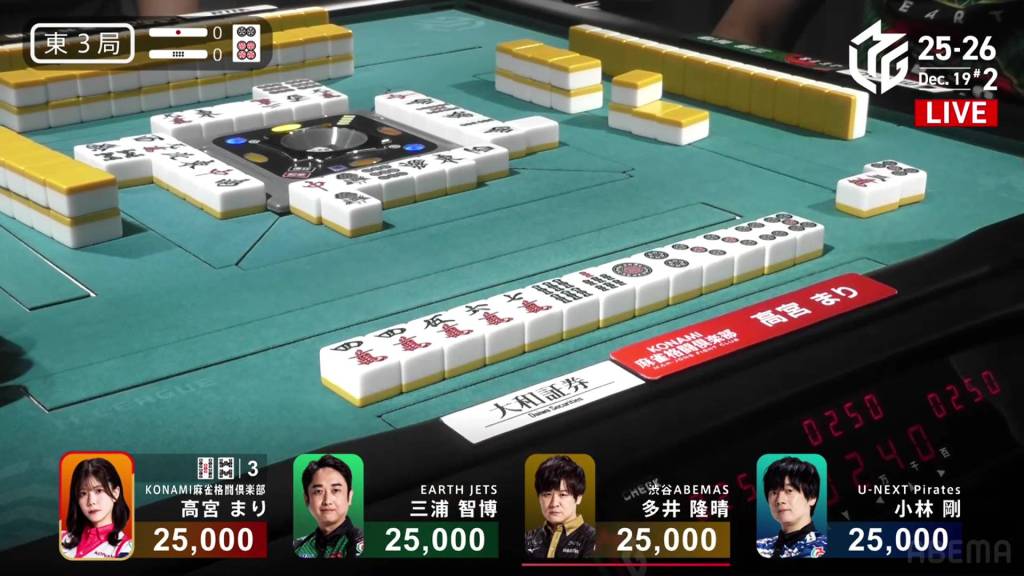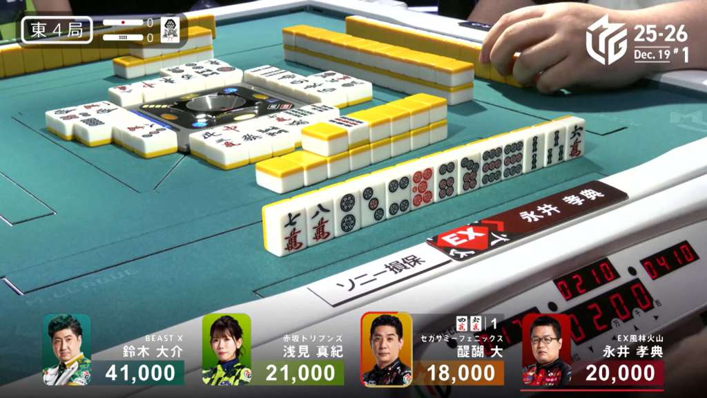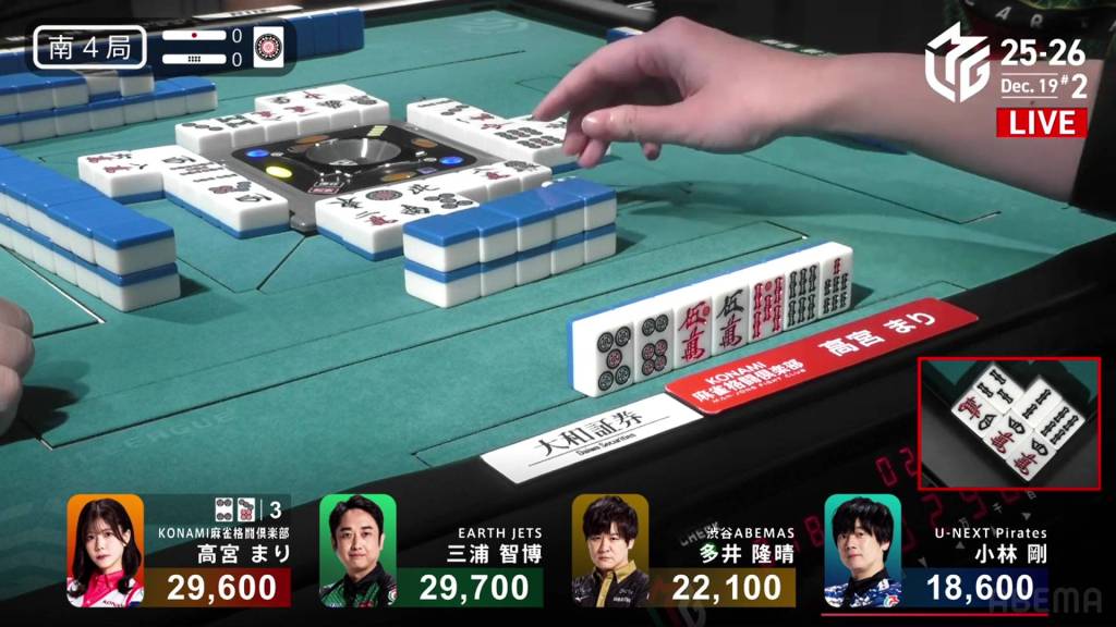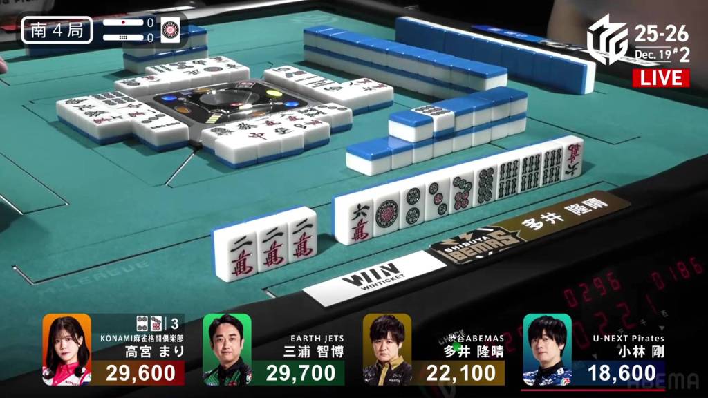 In S4-0, Takamiya is in 2nd place and is just 100 away from 1st place. Any win will be enough, and even tenpai payments could be the difference.
