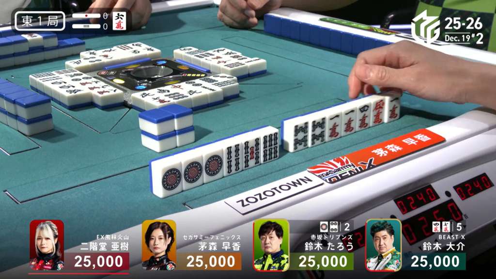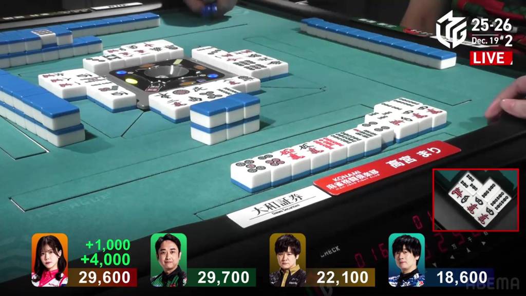 This call, however, was just the shift Mizuhara needed. On her very next draw, she gets the red 5p and wins the hand. Mizuhara wins with Riichi/Tsumo/Dora 1/Aka 1 for 4,000 all, moving her up to 1st place.
