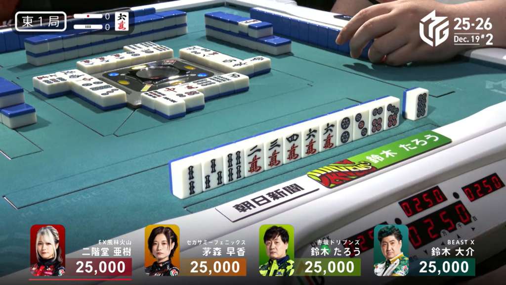 However, within the ippatsu round, Takamiya draws the 4p and wins the hand. Takamiya wins the hand with Tanyao/Aka 2 for 1,000/2,000 plus one riichi stick, finishing the game in 1st place.