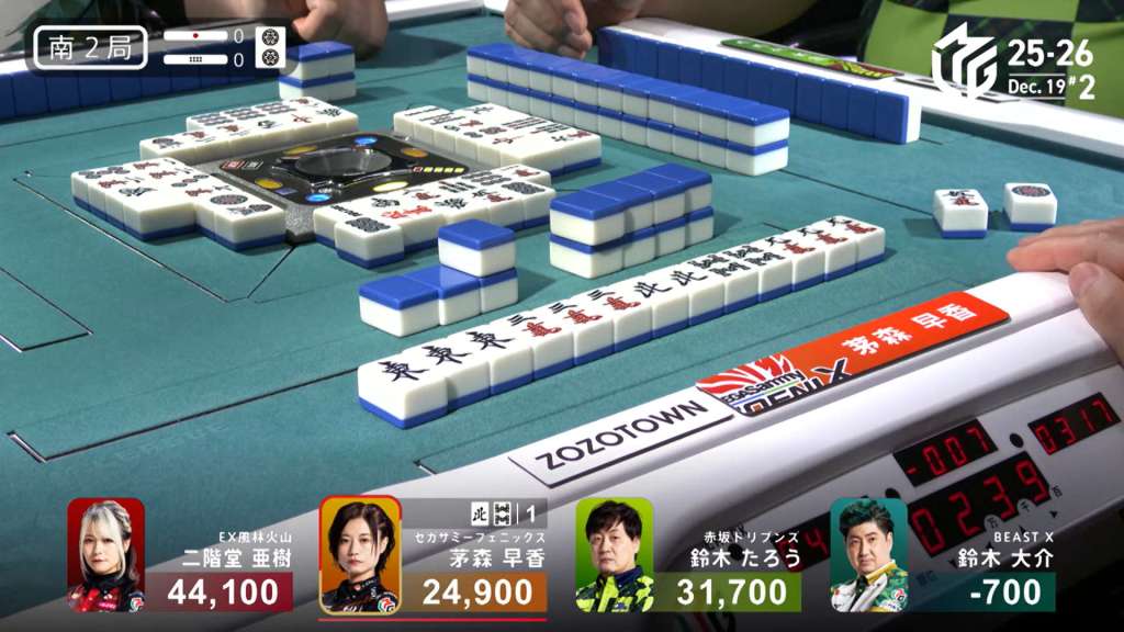 In S2-0, Kayamori is the dealer in 3rd place, 6,800 behind 2nd place Taro and 19,200 behind 1st place Aki.