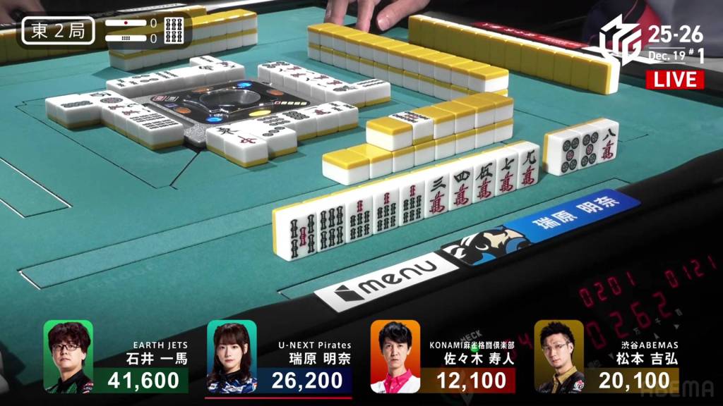 Next to him, Daisuke is at a ryanmen-ryanmen iishanten. Just two turns later, Daisuke calls riichi on a 47m ryanmen.