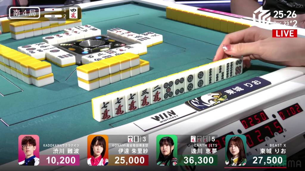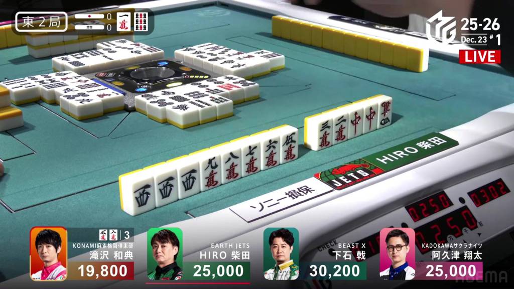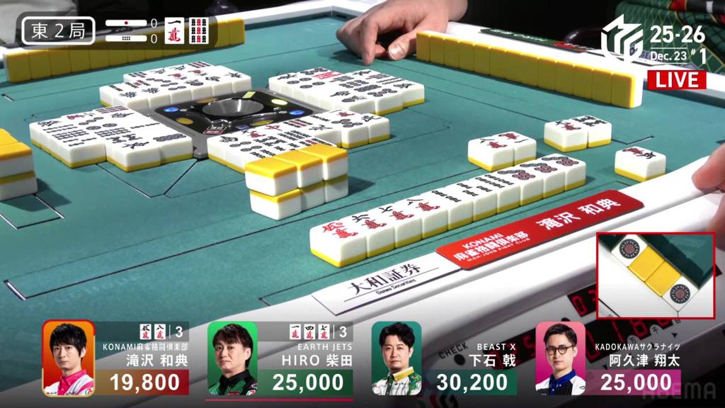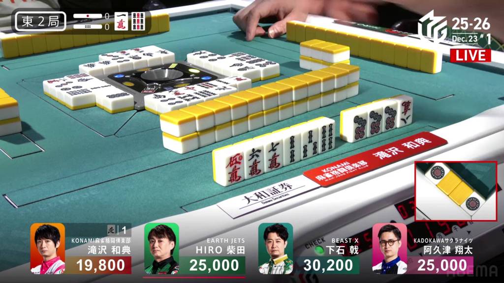 This hope is short-lived, however, as Takizawa draws the 5m just two turns later and wins the hand. With a lot of fu, Takizawa’s Riichi/Tsumo/Aka 1hand is enough for a 2,000/4,000 mangan.