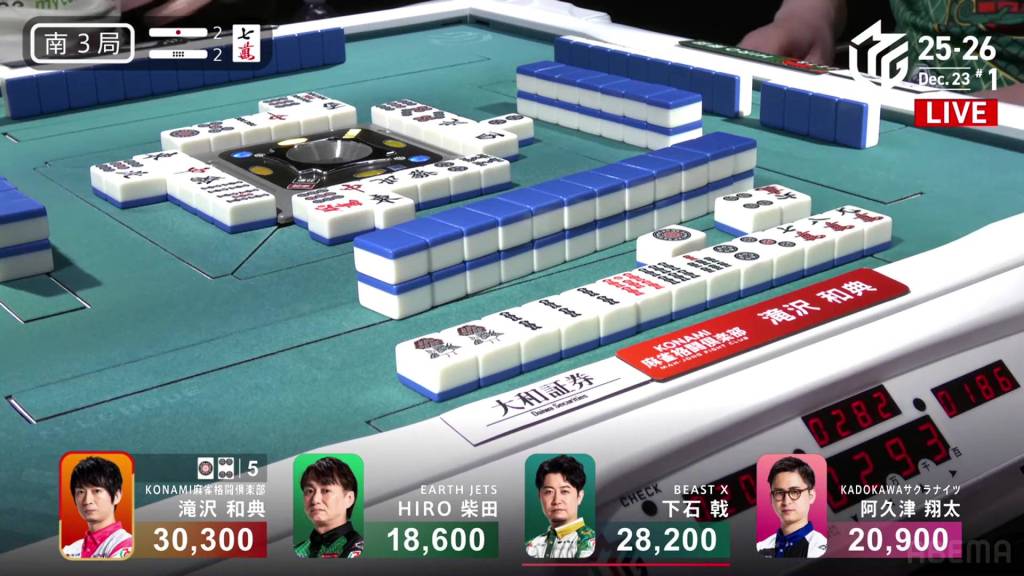 In S3-2, Takizawa is in 1st place with a narrow 2,100 lead over dealer Shimoishi. With two riichi sticks and two honba in the pot, the point boost makes his position very precarious, especially just one step away from the final hand.