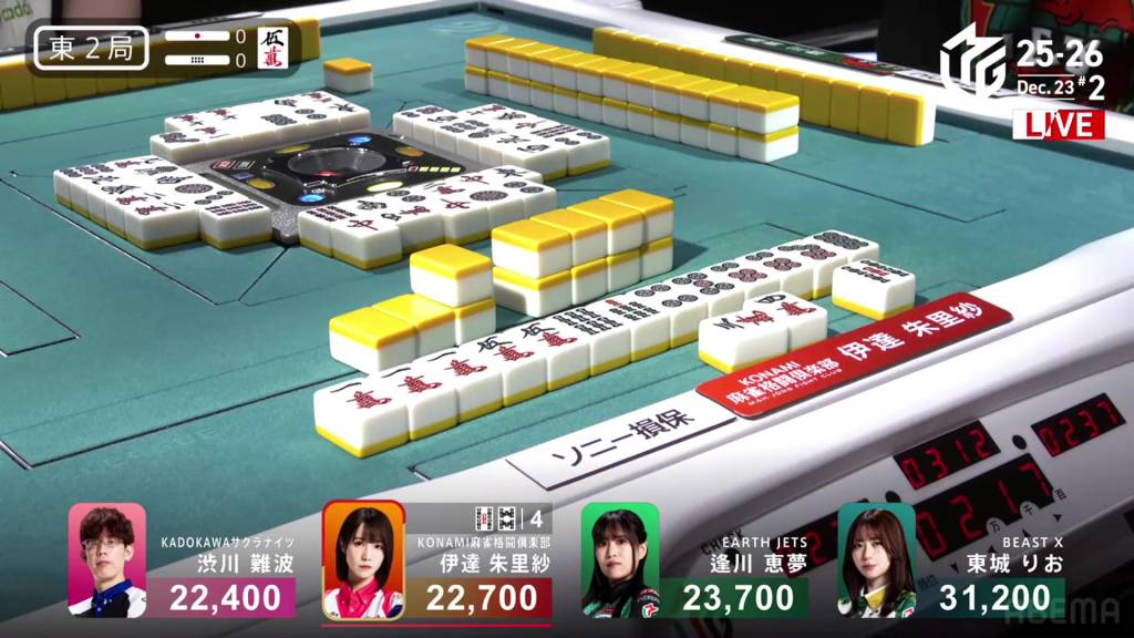 In E2-0, Date is the dealer in 3rd place, 1,000 behind 2nd place Aikawa and 8,500 behind 1st place Tojo.