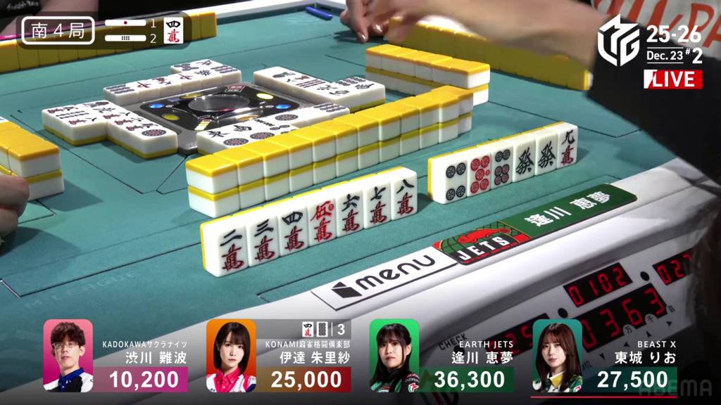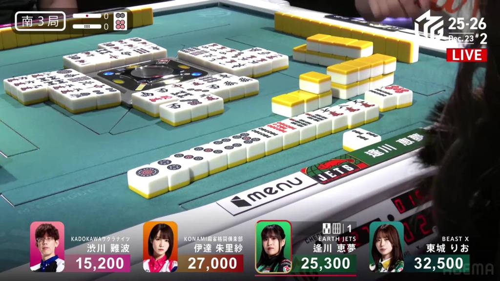In S4-2, Aikawa is in 1st place holding a 8,800 lead over 2nd place Tojo. She wants to win this hand to secure her second win of the season. A riichi stick and two honba are in the pot.