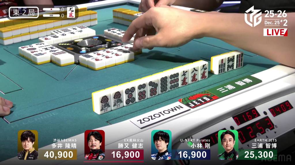 In E2-0, Katsumata is the dealer in a 3rd place tie and is 8,400 behind 2nd place Miura and 24,000 behind 1st place Ooi.