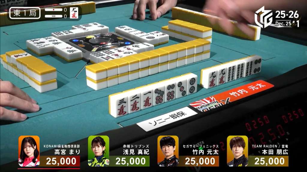 Genta starts out the hand by filling in a kanchan to get to 3-shanten. For value, he holds the red 5m as part of a pair and has the ability to draws a 2p dora. In the first row, he pairs up the 7s for iishanten. At the start of the second row, he draws the 2p for iishanten and is just a 6p away from a pinzu start. Two turns later, he makes a triplet of 5m and calls riichi on a 36p ryanmen wanting the latter. On his ippatsu pick, he gets the 6p and wins the hand. Genta wins with Riichi/Ippatsu/Tsumo/Ittsuu/Dora 1/Aka 1 for 6,000 all, cutting Honda’s lead down to 10,900.