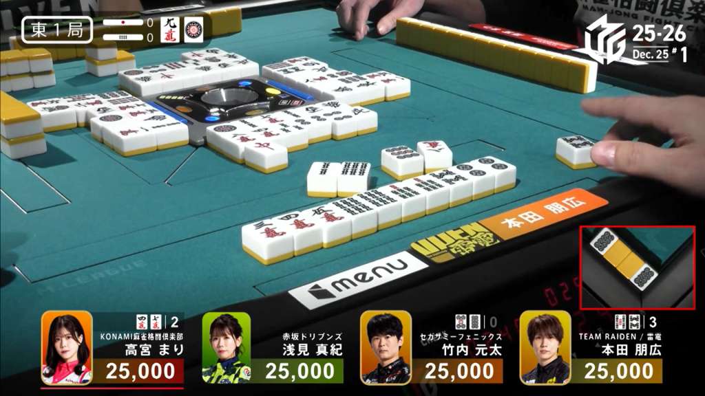 When it comes back around to Honda, he makes an 8p triplet and calls riichi on a 58s ryanmen. At the start of the third row, he draws the fourth 8p (Genta’s last winning tile) and calls a concealed kan. Though his rinshan doesn’t help, he gets the 8s on his next turn and wins the hand. Hitting two uradora, Honda wins with Riichi/Tsumo/Tanyao/Iipeikou/Ura 2 for 3,000/6,000 plus two riichi sticks.