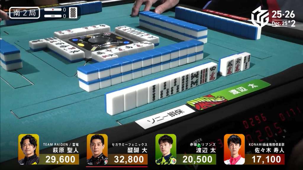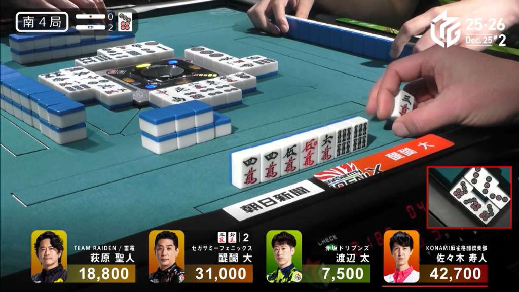In S4-2, Daigo is 2nd place and is 11,700 behind 1st place dealer Histo. With a 3/50 or 4/25 direct hit, a mangan tsumo or a haneman ron, Daigo can finish the game on top.