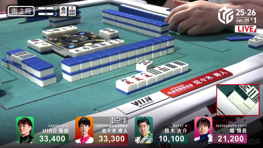 On Kazuma’s turn, he makes a 2m triplet for tenpai and calls riichi on a 58m ryanmen. In the third row, he draws the 5m and wins the hand. Kazuma wins with Riichi/Tsumo/Tanyao/Aka 1 for 2,000+100/4,000+100 plus a riichi stick, enought to move into 1st.