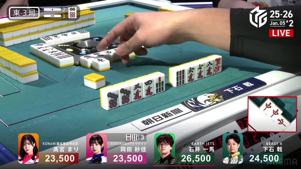 Though there is this hope, Takamiya is faster. Having already called twice, she gets to tenpai near the end of the second row and waits on a 25m ryanmen.