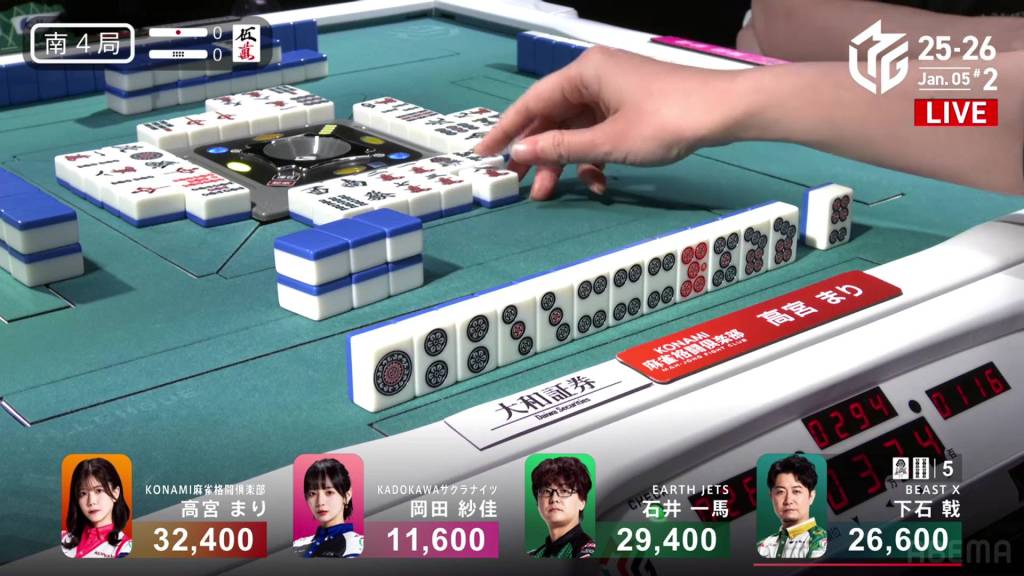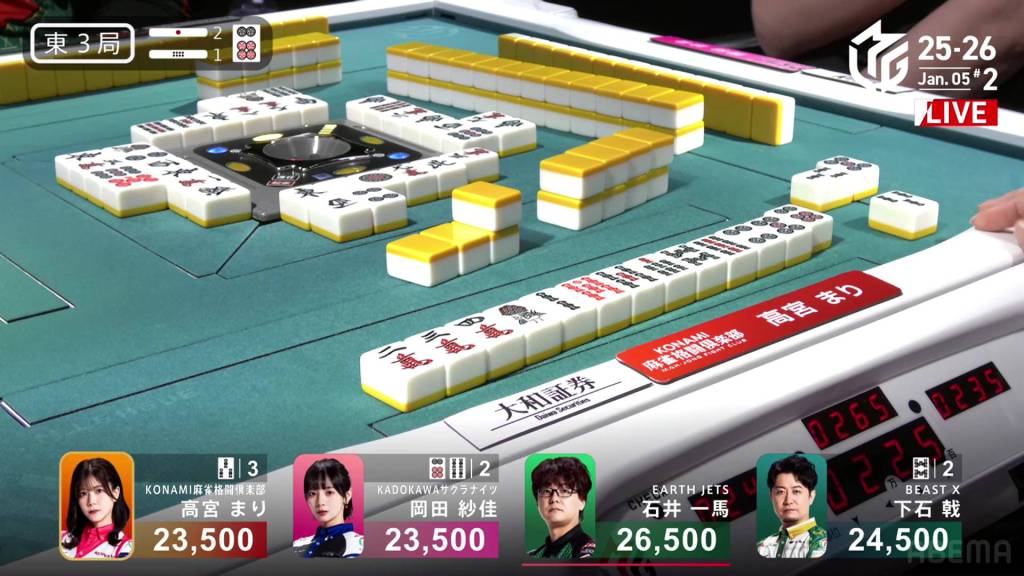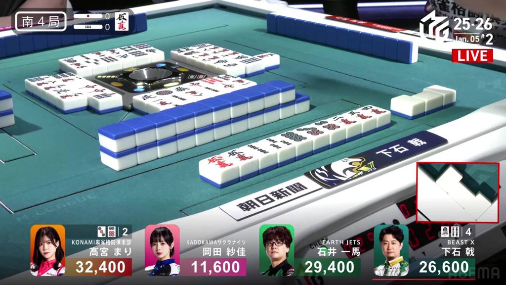 However, on Daisuke’s next turn, he draws and discards the red 5m and deals into Shibata. With an uradora hit, Shibata wins the hand with Riichi/Pinfu/Tanyao/Aka 2/Ura 1 for 18,000.