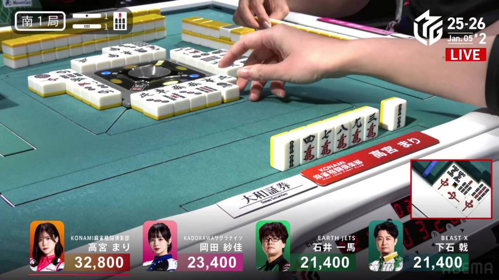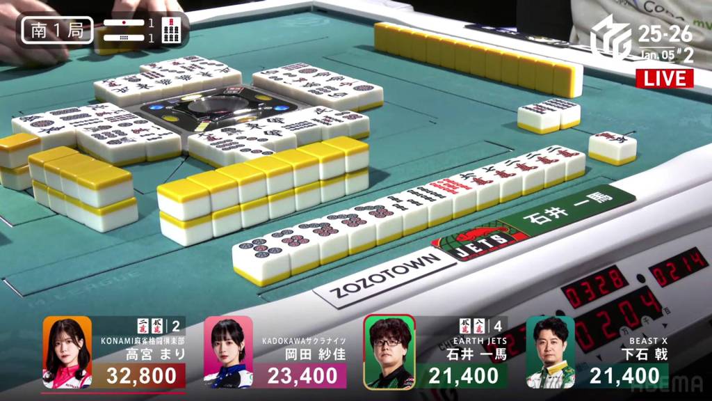 In S1-1, Kazuma is in a 3rd place tie, 2,000 behind 2nd place Okada and 11,400 behind 1st place dealer Takamiya. A riichi stick is in the pot.