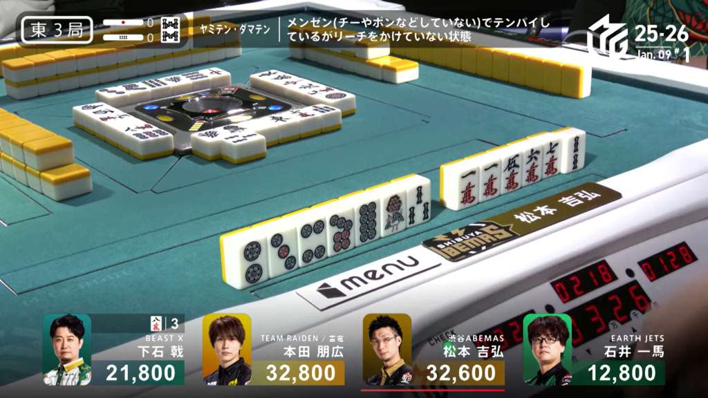 Within the go-around, he is challenged by dealer Matsumoto as he gets to a pinfu tenpai and calls riichi on a 69p ryanmen.