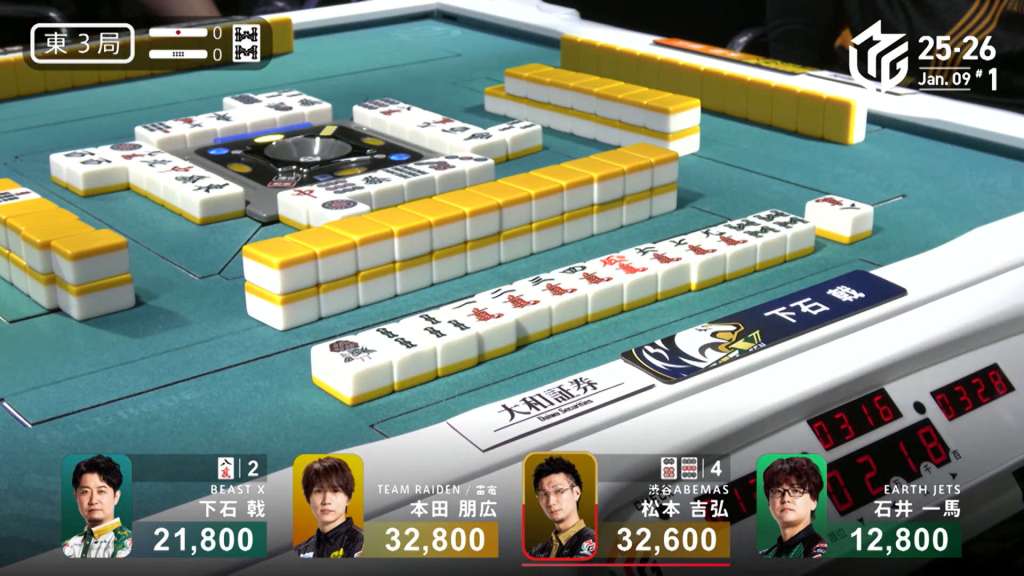 In E3-2, Shibukawa is the dealer in 1st place, only holding a 2,100 lead over 2nd place Futoshi.