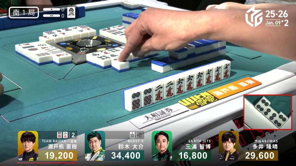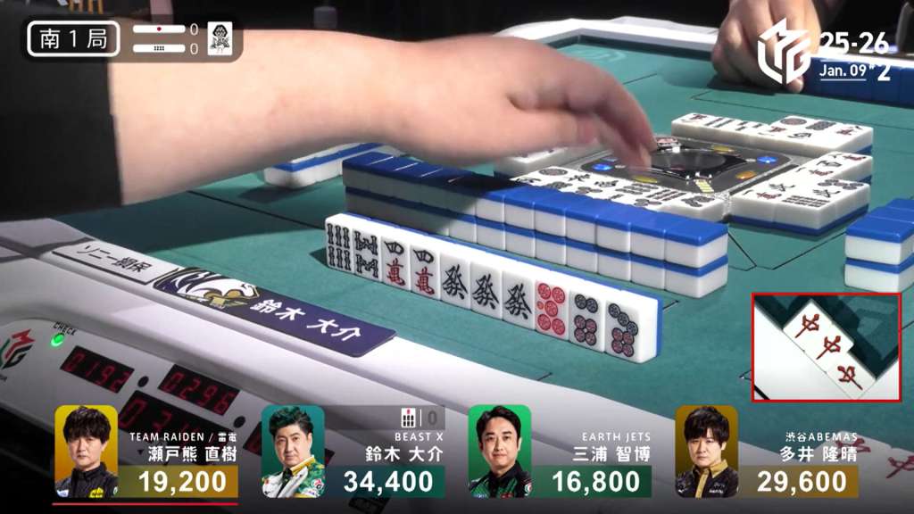 On Miura’s turn, he gets to tenpai and calls riichi on a 1s/7s shanpon.