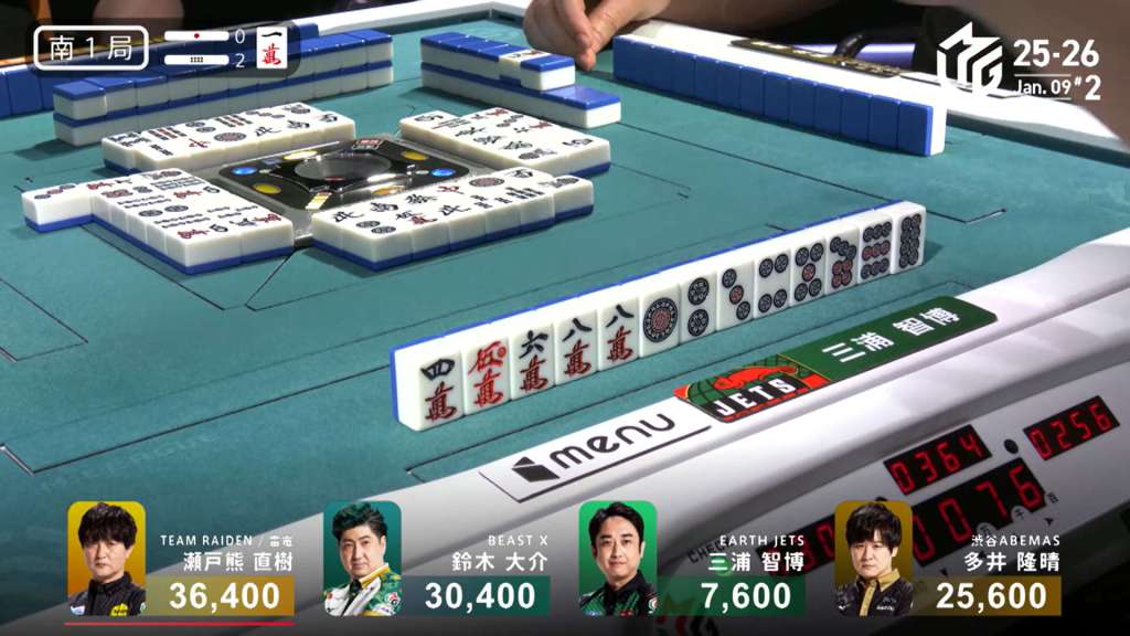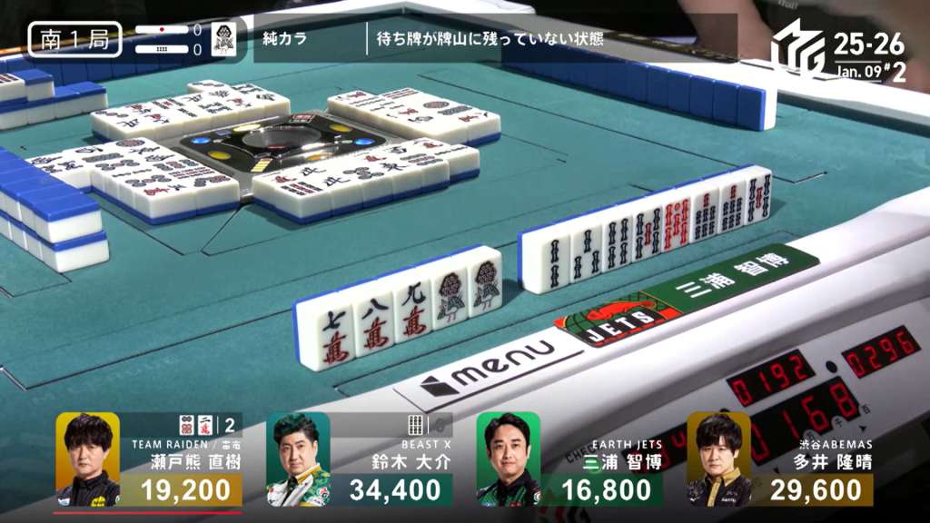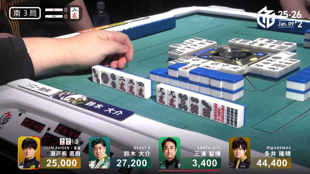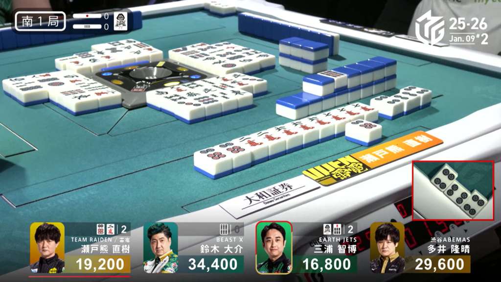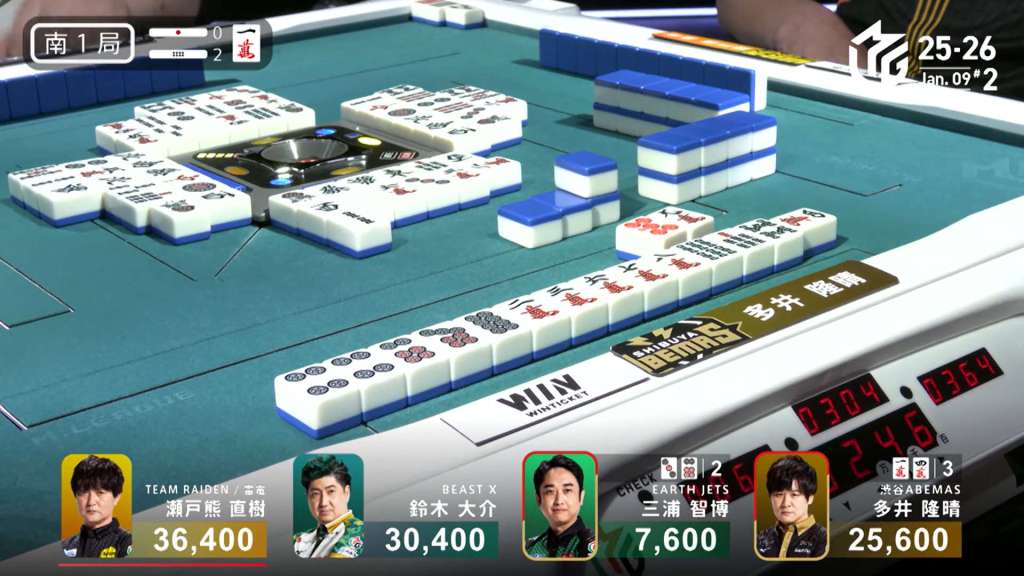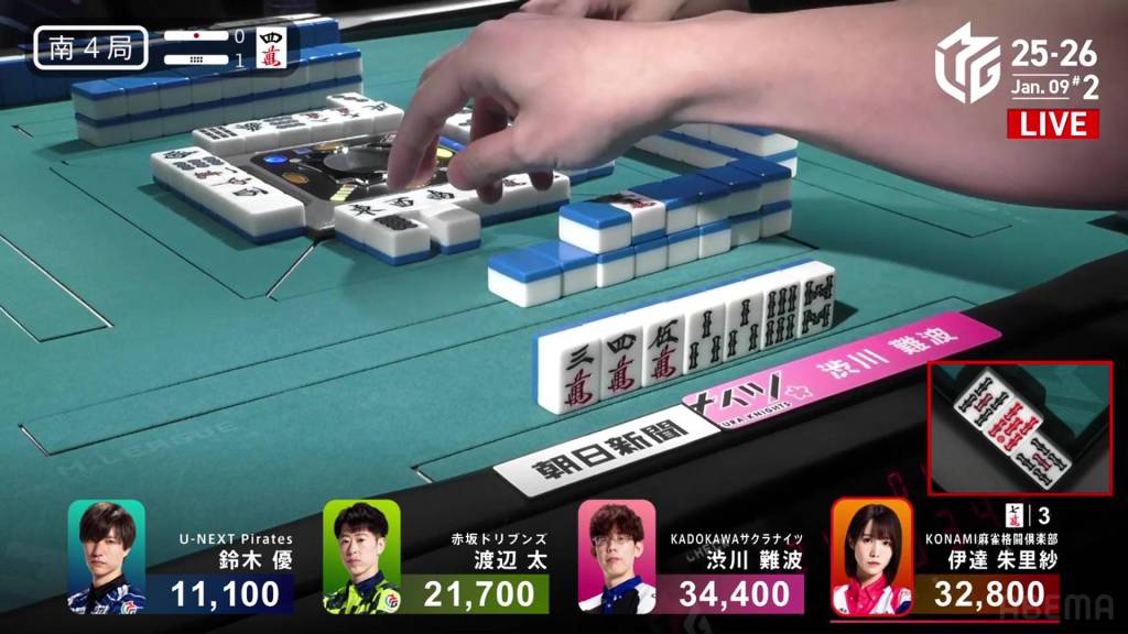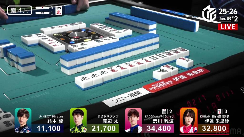 In S4-1, Date is the dealer in 2nd place, 1,600 behind 1st place Shibuawa. Any hand is enough to move into top spot.