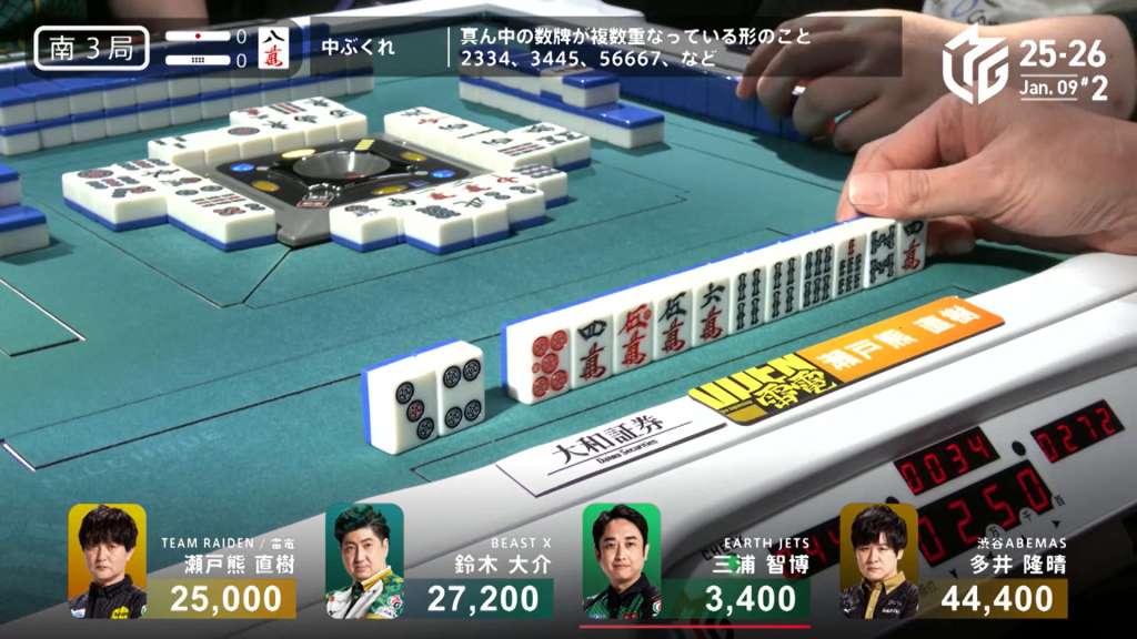 On Daisuke’s turn, he make a triplet of 4m and switches to a 6s tanki, though that wait is no good either with none left in the wall.