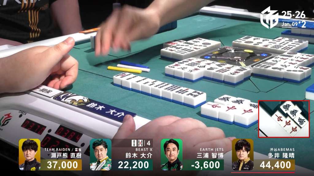 Two turns later, Setokuma draws a a third 6m, putting him one-away from a possible yakuman.
