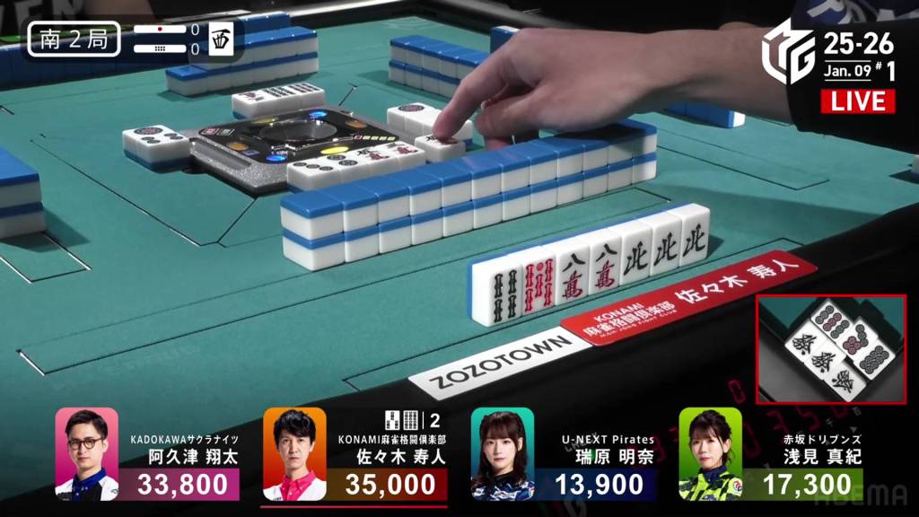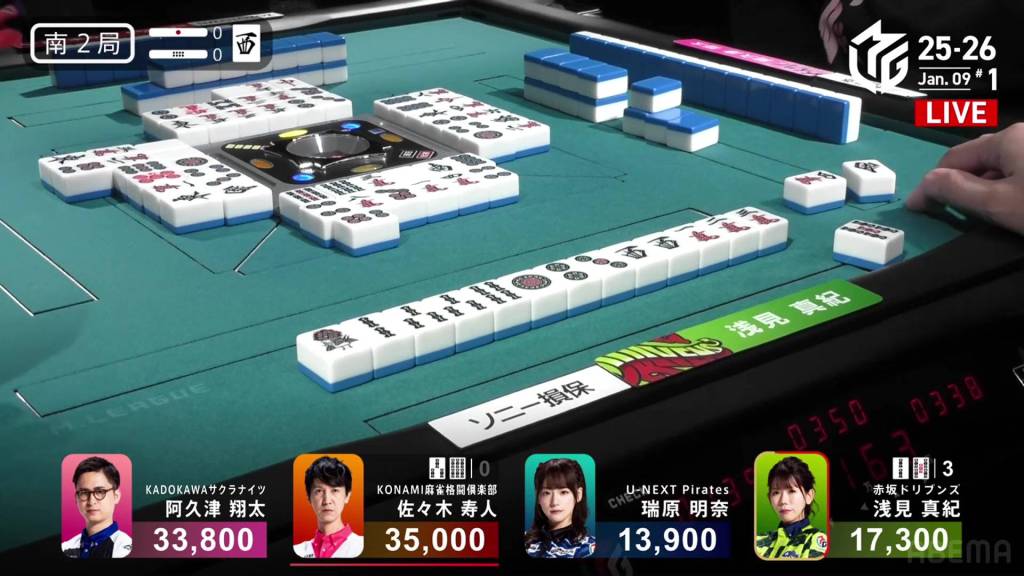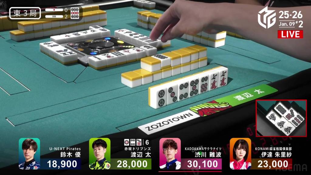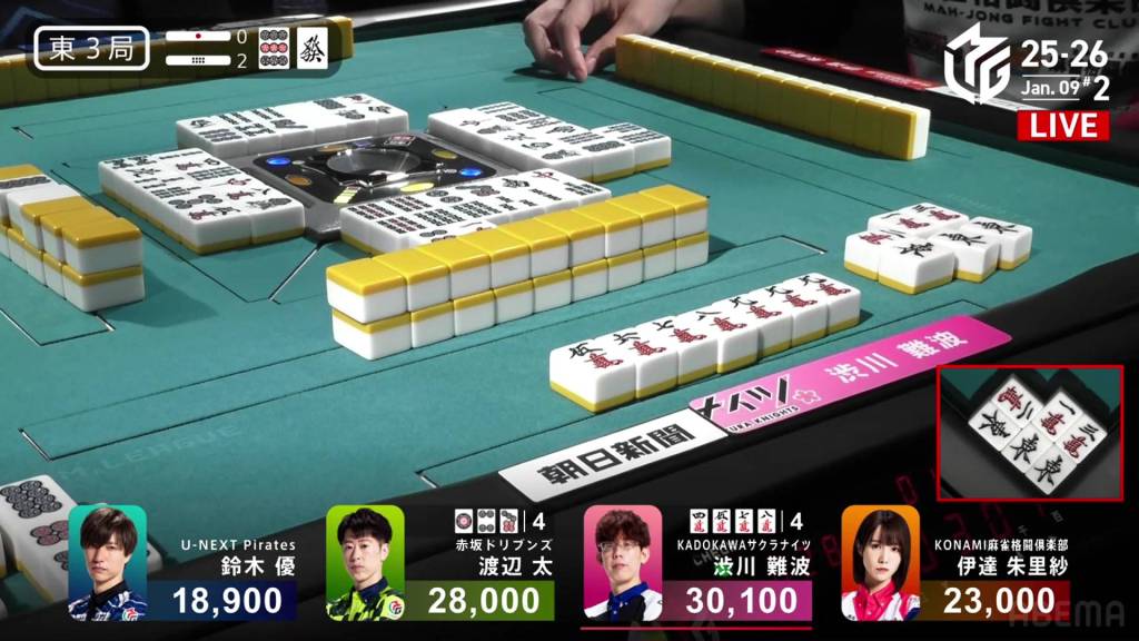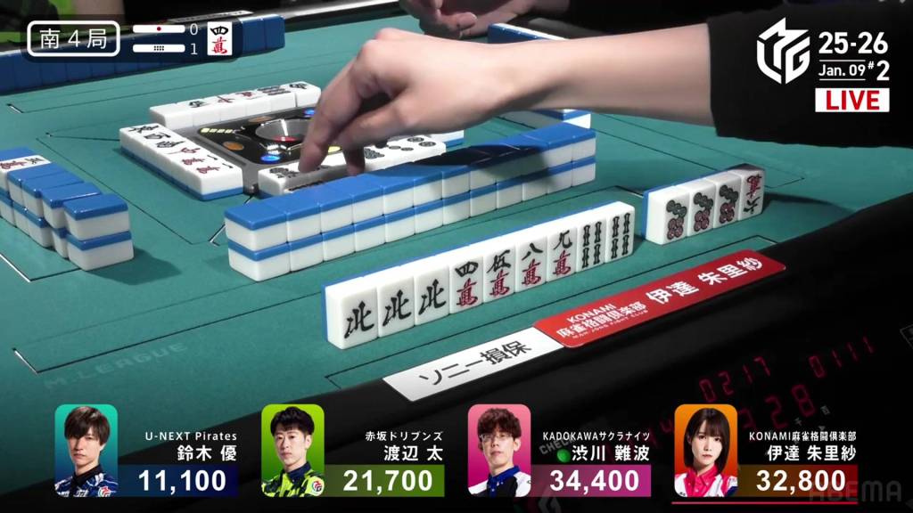 But, this shifts the wall to Date’s favour as she draws the 7m on her very next turn. Date wins with Riichi/Tsumo/Dora 1 for 2,600+100 all, moving into 1st with a 9,200 lead.