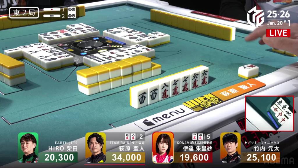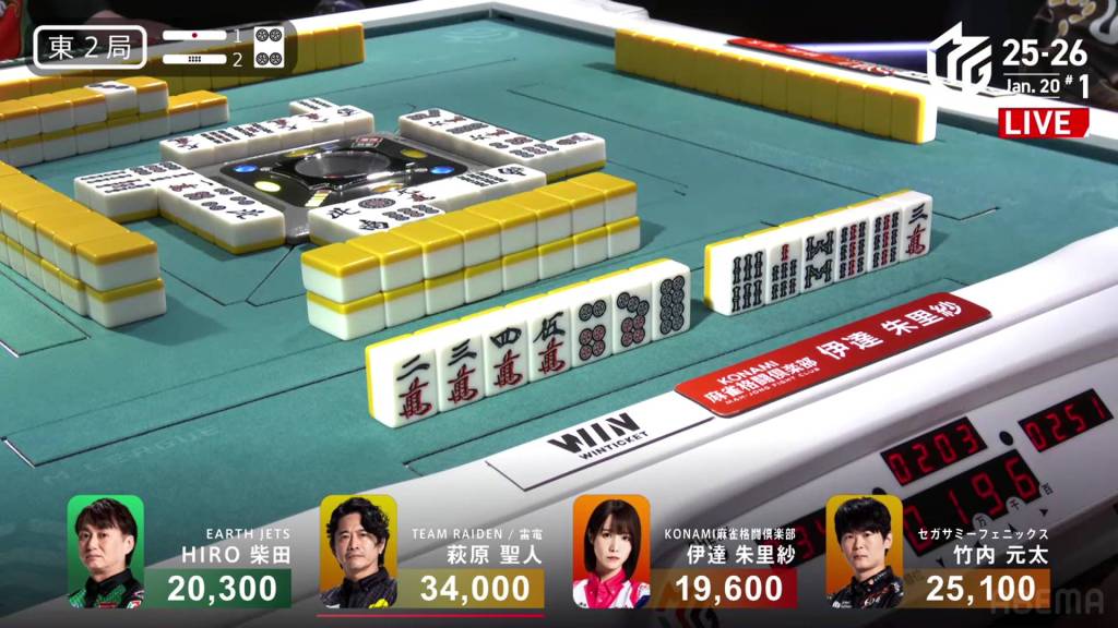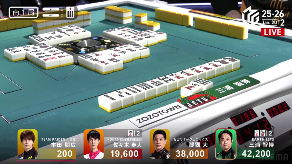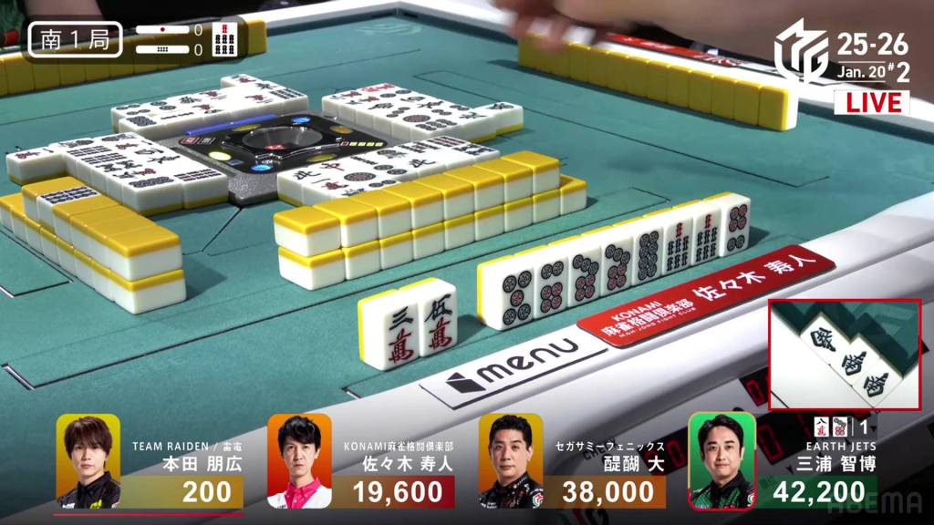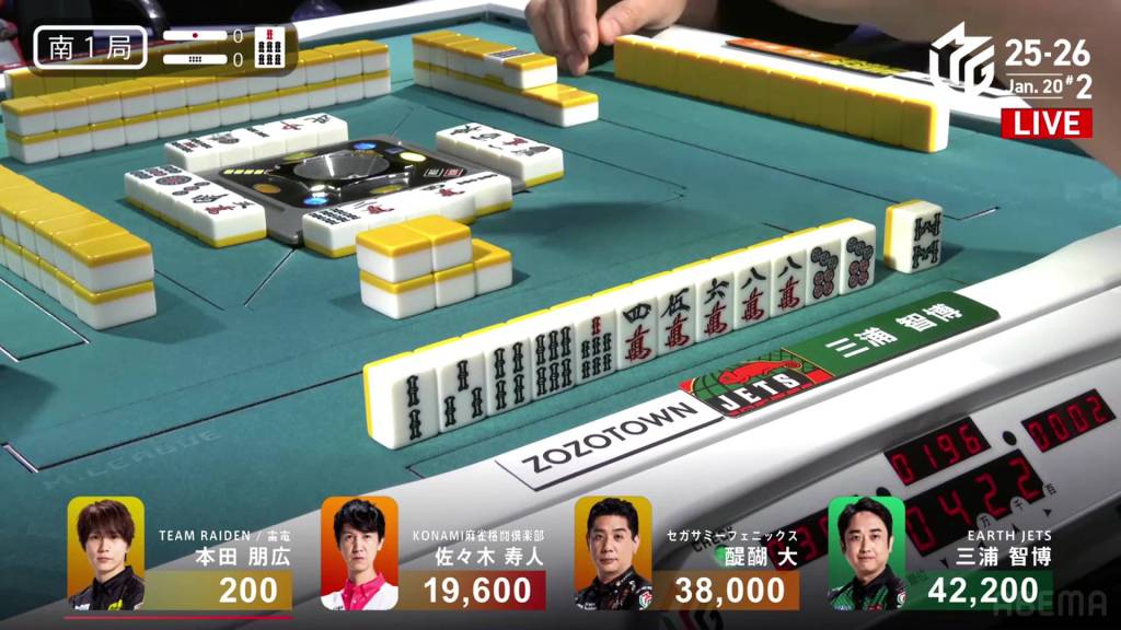 However, Hisato won’t get another draw. Within the go-around, Honda discards the 8m tyring to call riichi and deals into Miura. With an uradora hit, Miura wins the hand with Riichi/Tanyao/Dora 1/Ura 1 for 8,000, getting Miura up to 50,200.