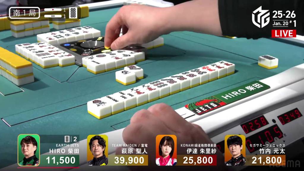 In S1-1, Shibata is the dealer in 4th place, 10,300 behind 3rd place Genta and 14,300 behind 2nd place Date. A stick is in the middle.