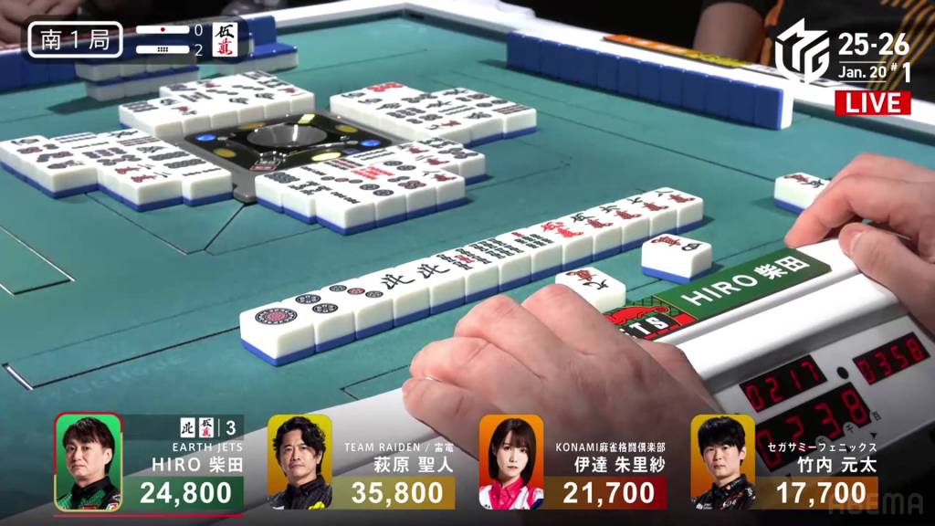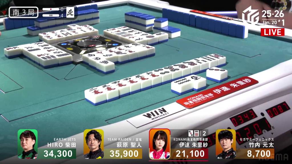 In S3-4, Date is the dealer and is in 3rd place. She has already made a dent in the lead after hitting Shibata with a 3-han hand, pushing him down into 2nd place. Date is now 13,200 behind 2nd place and 14,800 behind 1st place Hagiwara.