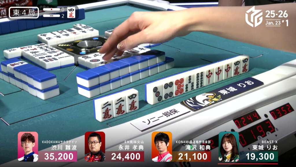 As Nagai shuffles some tiles around, Tojo draws a triplet of 4m dora and gets to tenpai on a 25s ryanmen. She stays dama and waits with mangan minimum, wanting a tsumo for a haneman.