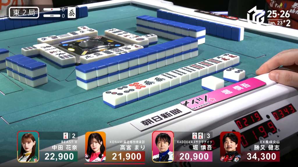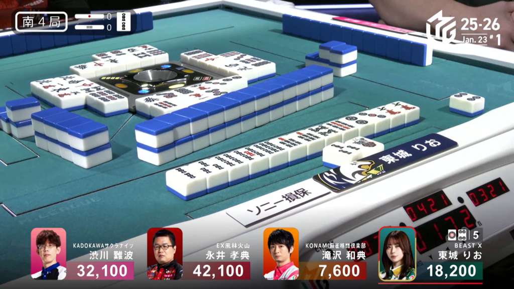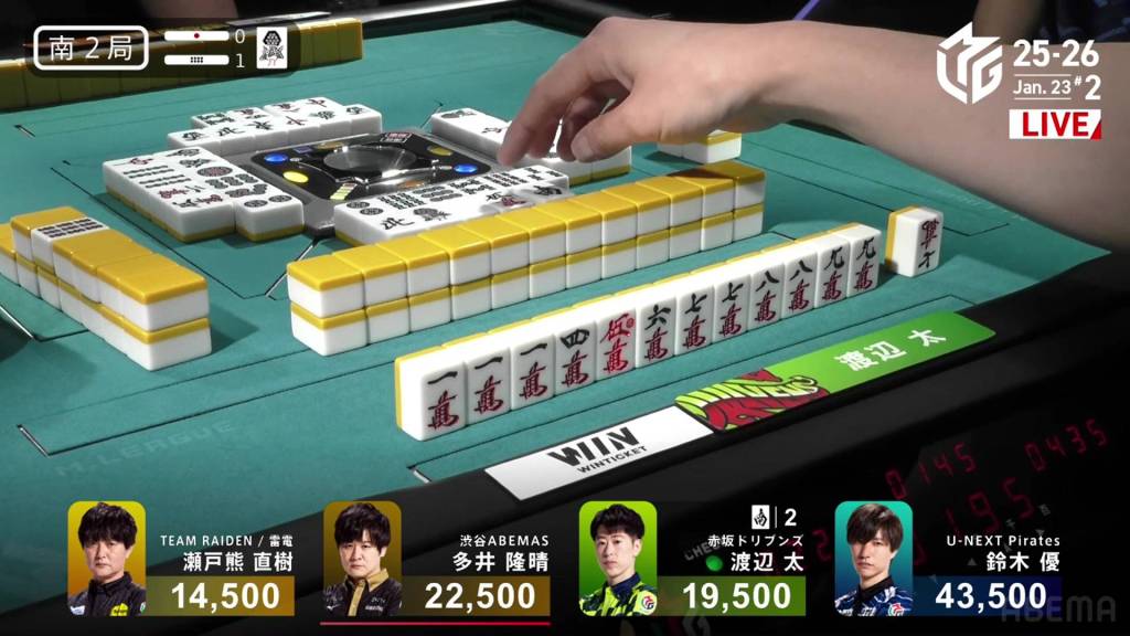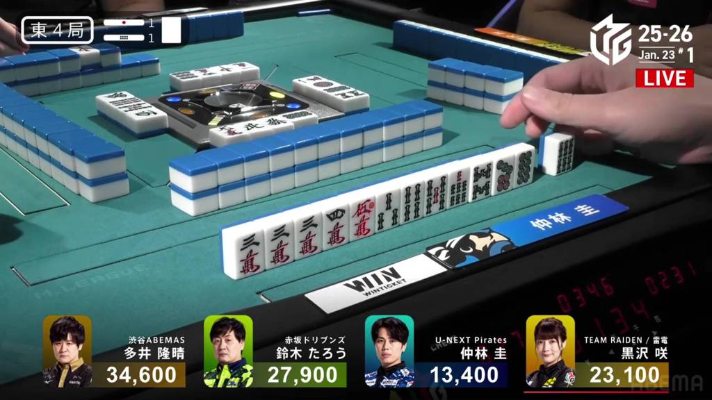 Nakabayashi has five winning tiles while Kurosawa only has two. But, Kurosawa defies the odds by drawing the 7p at the end of the second row and winning the hand. Kurosawa wins with Riichi/Tsumo/Dora 2 for 4,000+100 all plus two riichi sticks, moving into 1st.