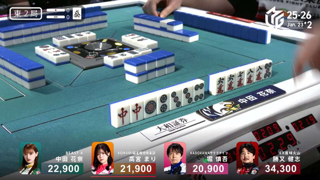 As fast as Hori is, Nakada was 2-shanten from the start. With just as good efficiency as Hori, Nakada gets to tenpai first and calls riichi on a 7m kanchan.