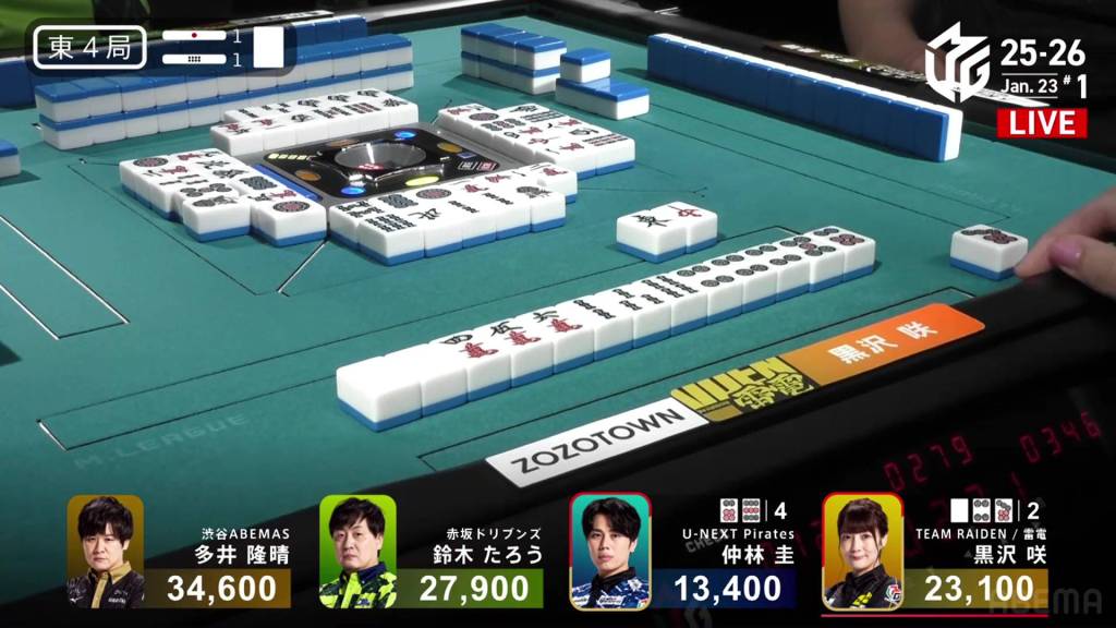 In E4-1, Kurosawa is the dealer in 3rd place, 4,800 behind 2nd place Taro and 11,500 behind 1st place Ooi. A riichi stick and a honba will give the next winner bonus points.