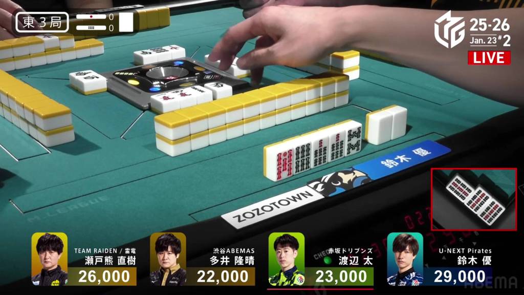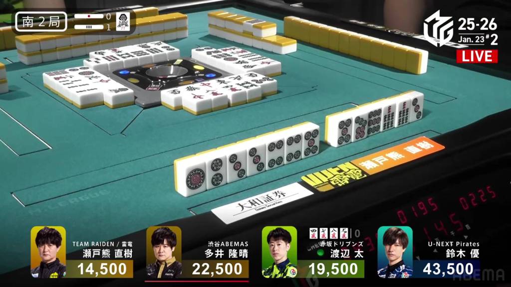 There is a short scare for Ooi potentially discarding the 8m (a tile safe against Setokuma), but Ooi escapes.