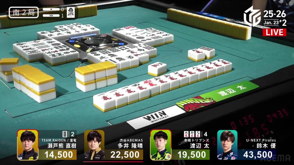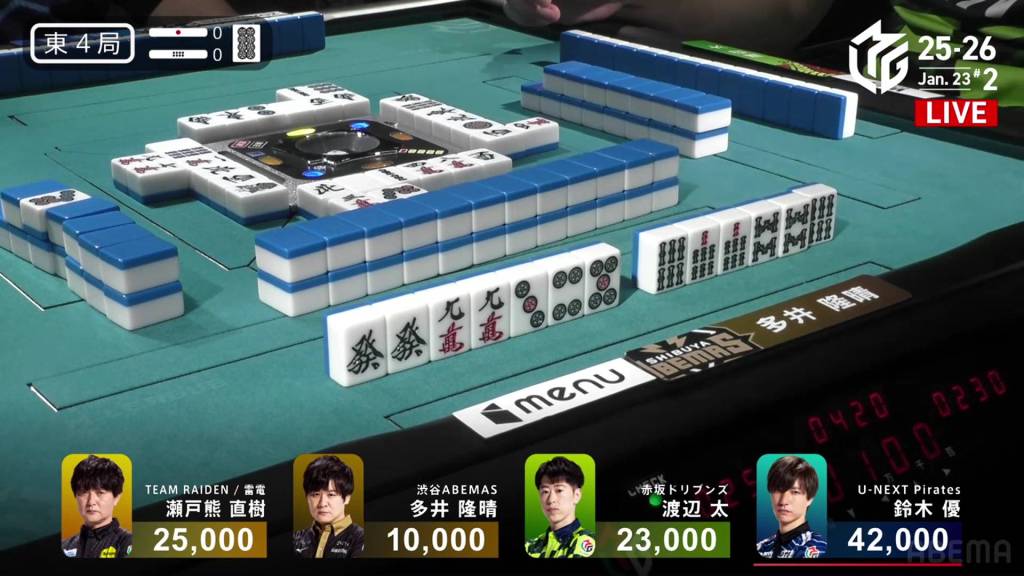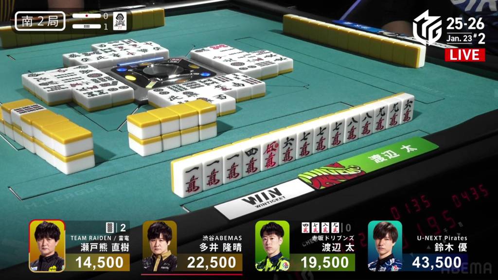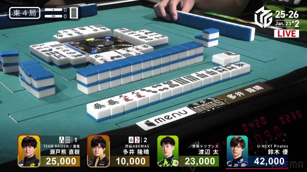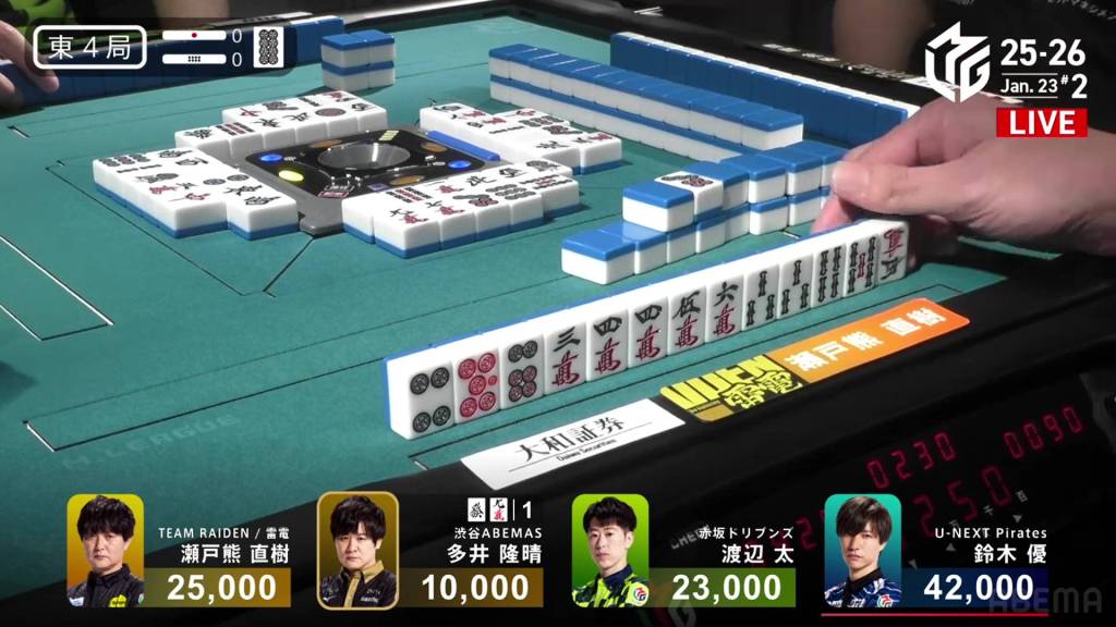 With nobody discarding manzu anyways, Futoshi decides to call riichi on a 369m wait to boost the hand’s value. Within the go-around, Setokuma draws and discards the 3m and deals into Futoshi. With the flip, the two 7m in Futoshi’s hand are now worth 1 han each, an unexpected boost. Futoshi wins the hand with Riichi/Ippatsu/Chinitsu/Iipeikou/Aka 1/Ura 2 for an 12-han sanbaiman, awarding him 24,000+300 from Setokuma and enough to move into 1st place.