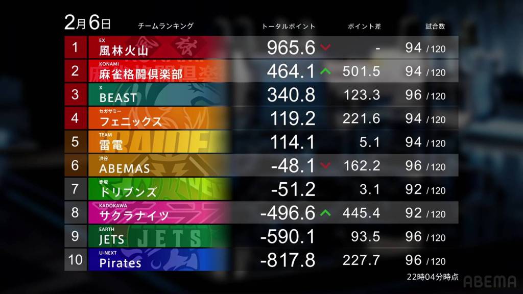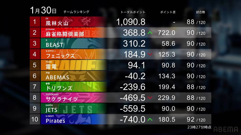 The Shibuya Abemas, Kadokawa Sakura Knights, Earth Jets, Sega Sammy Phoenix and U-Next Pirates all dropped. The Abemas were the top gainers on Monday, but it was only a 12.5pts gain, and though they gained some more points on Thursday, two losing games on Friday pushed them down a bit. The Kadokawa Sakura Knights had the definite highlight of Hori getting the yakuman, but it only gave him a 2nd place, leaving the team without a 1st place this week. The Earth Jets had three days this week and they got a 3rd place then a 2nd place on all three of them. The Sega Sammy Phoenix started with a 1st place on Thursday, but two 4ths and a 3rd in their remaining games gave them losses. And the U-Next Pirates continue to fall further and further as Yu got two 4ths this week