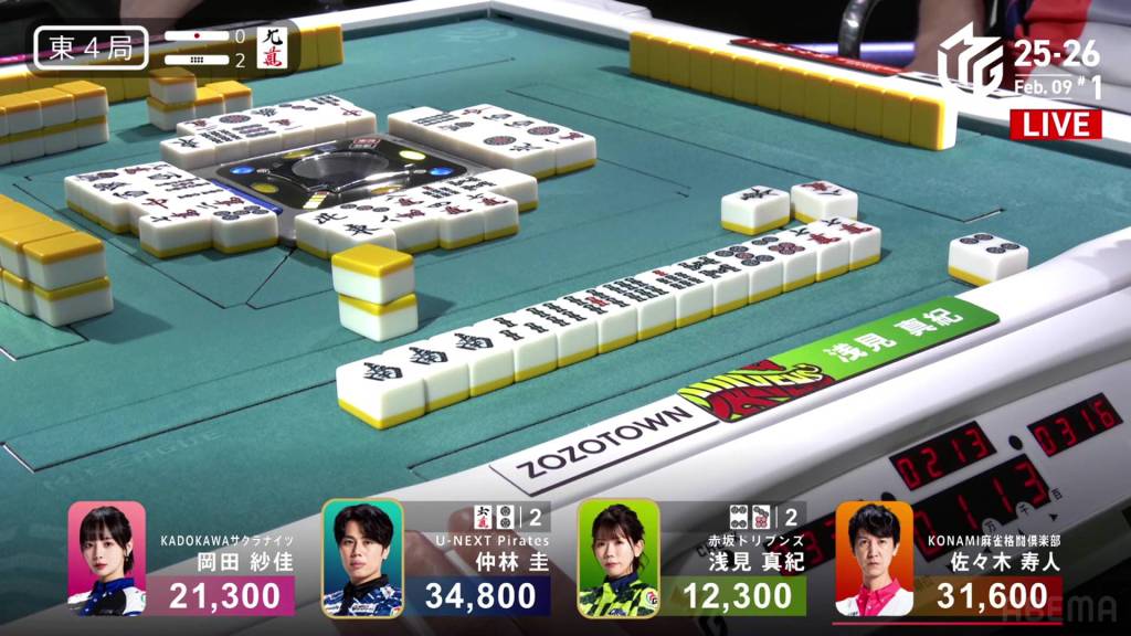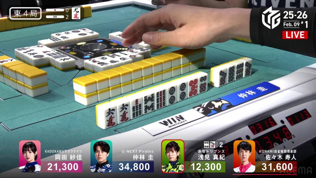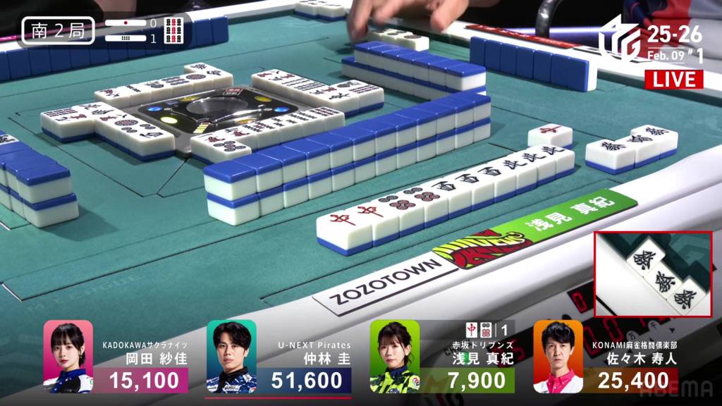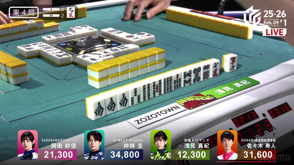 Two turns later, Asami draws the 4p and wins the hand. With the flip, she gets a big boost as her south triplet becomes the new dora. Asami wins with Riichi/Tsumo/Ura 3 for 2,000+200/4,000+200 plus a riichi stick, moving up to 3rd.
