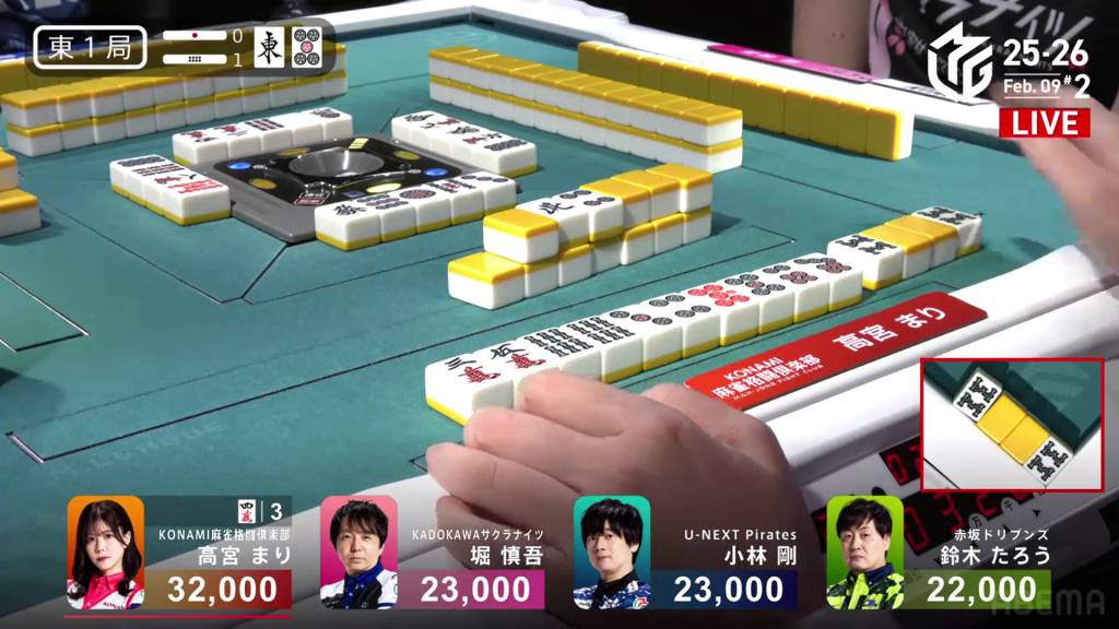 In E1-1, Takamiya is in 1st place after beating out a riichi and winning the first hand during her dealership.