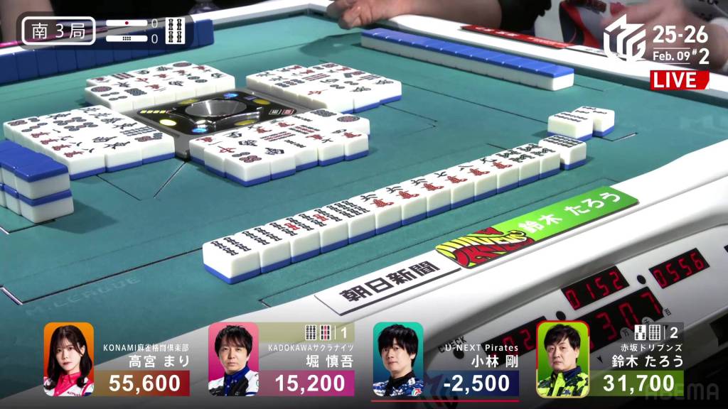 Within the go-around, Taro gets to tenpai as well and calls riichi on a 36s ryanmen, getting mangan minimum with a 6s win. Though, Takamiya manages to push her hand into the third row and actually switch to a 36s ryanmen as well, she ends up folding on a dangerous 9p draw on her last turn. Right after, Hori gets to tenpai on a 69s ryanmen, but is furiten.