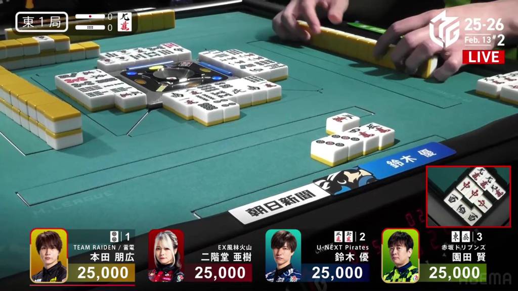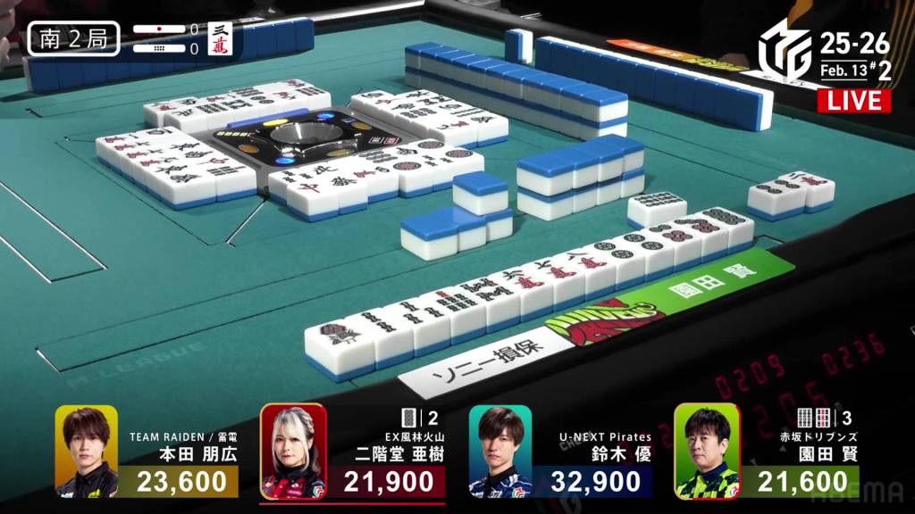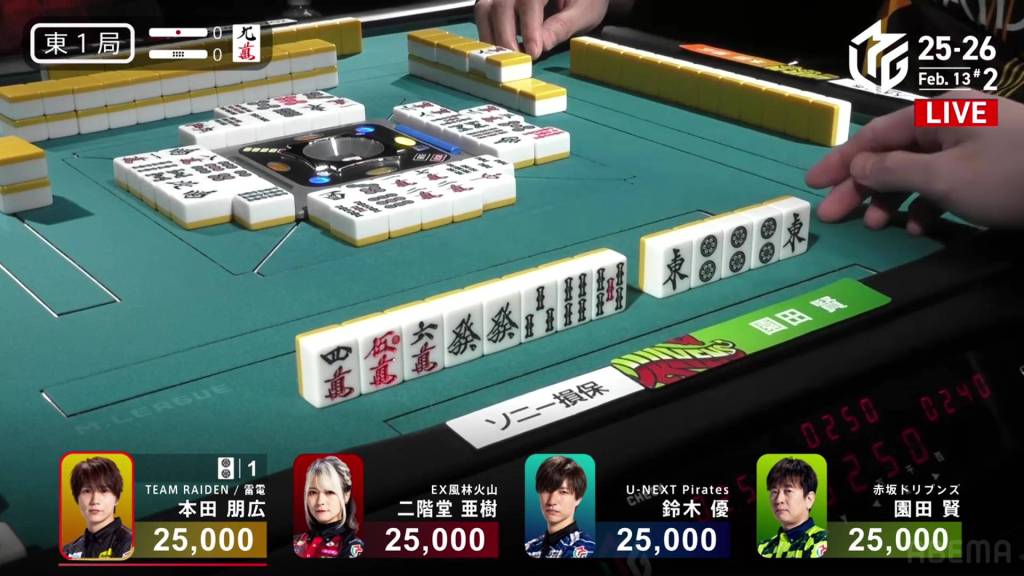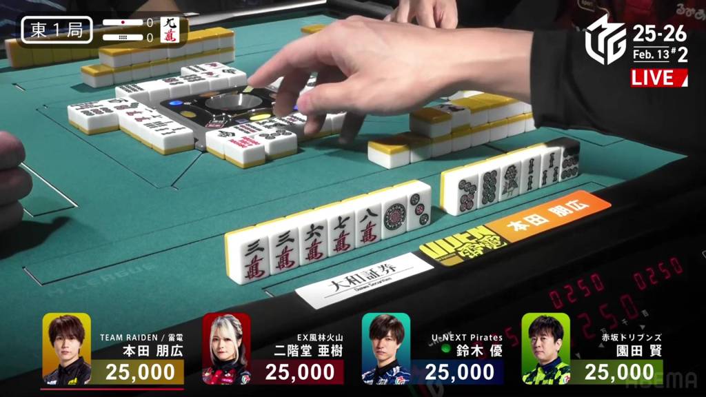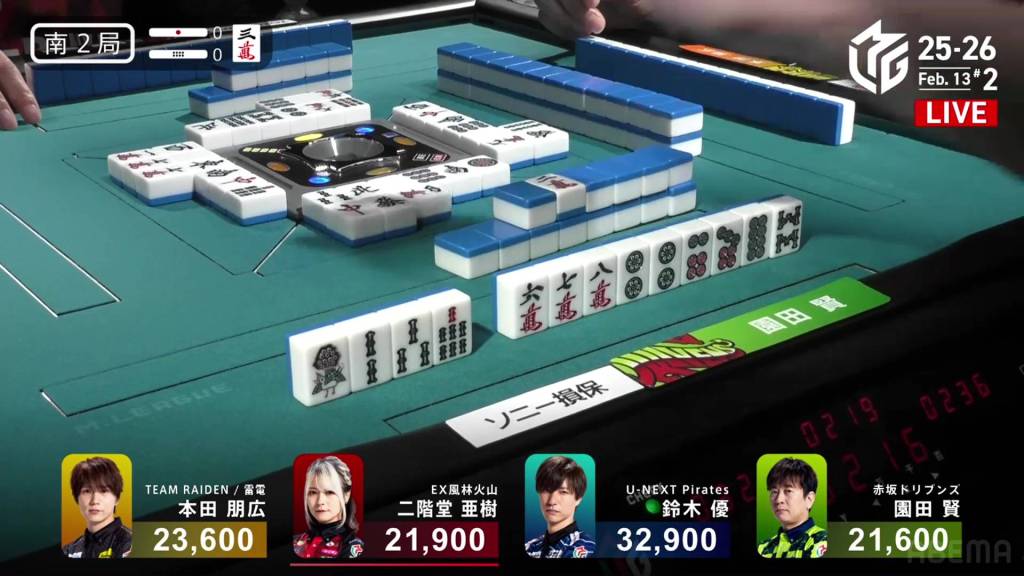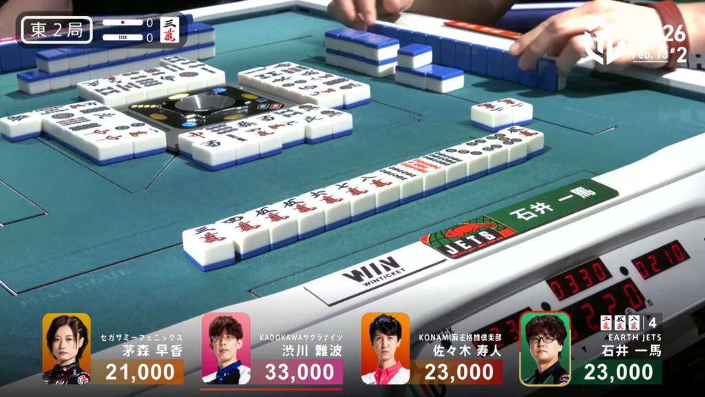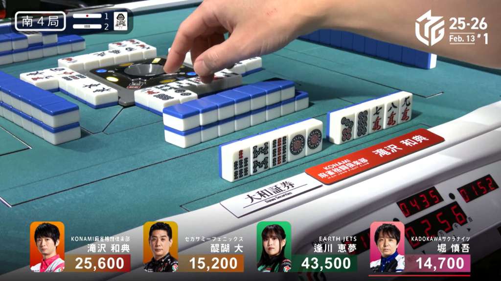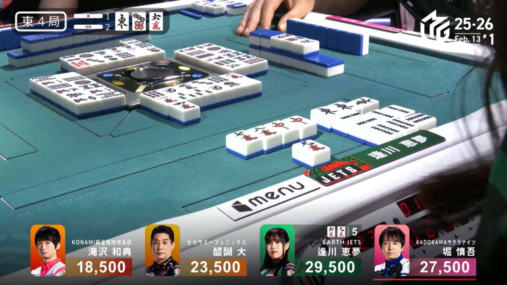 Across from him, Honda is comfortably moving forward, but lacking a yaku or value. But, since he is the dealer, he chooses to call riichi in the second row, throwing the 5p and waiting on the 2p.