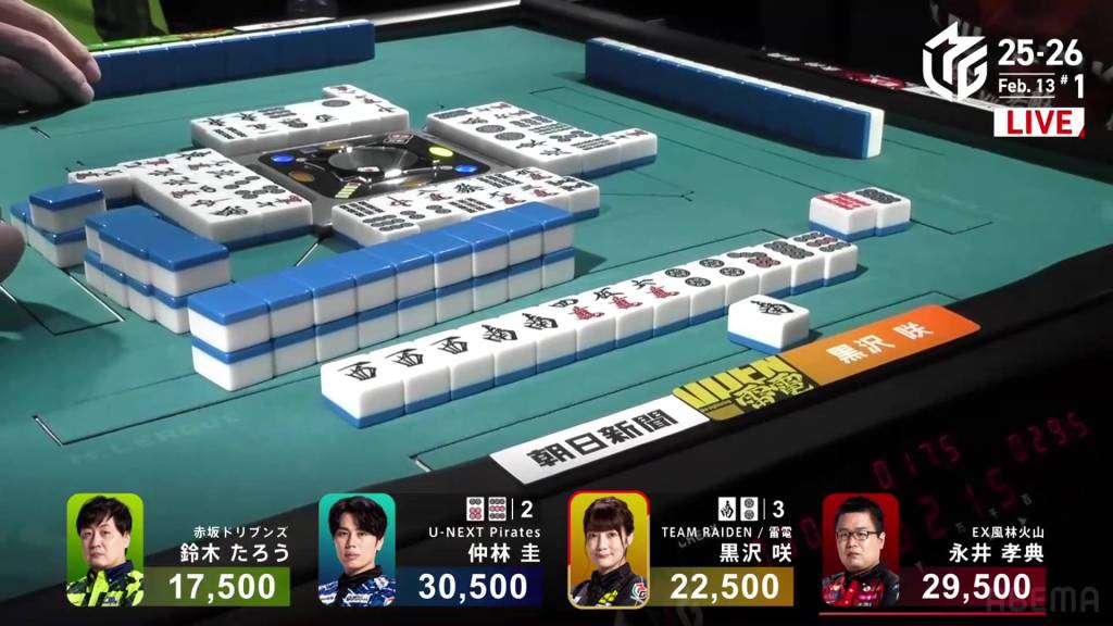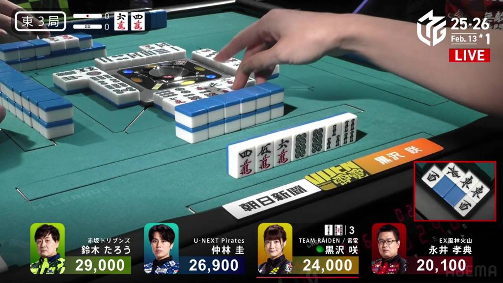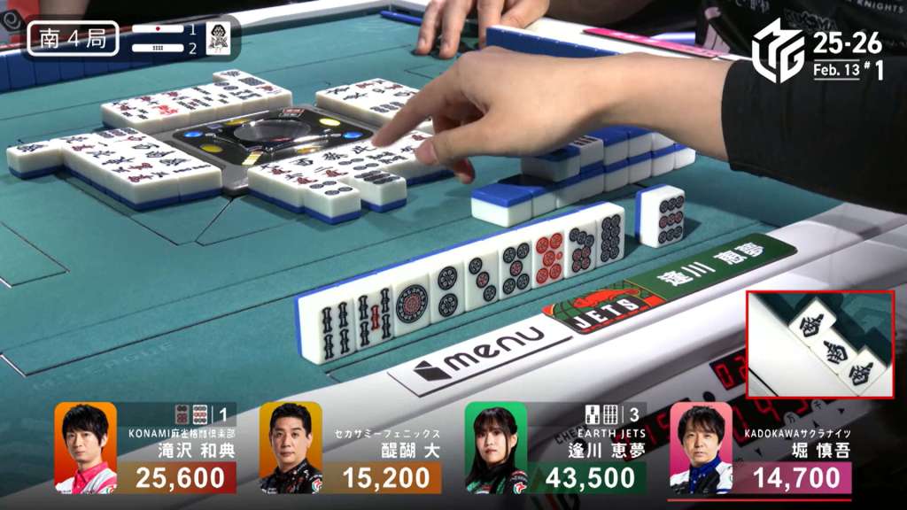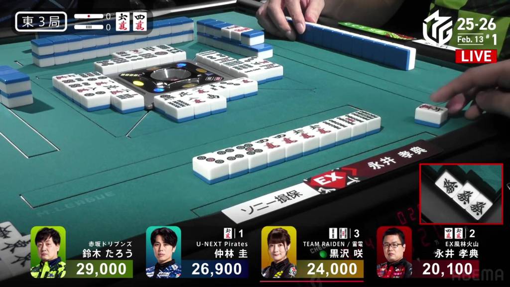In the second row, Kurosawa the dealer makes a concealed kan on the west. The kandora flip is the 4m, which gives Nagai a potential additional han. Soon after, Kurosawa calls pon on the east and gets to tenpai on a 25s ryanmen.