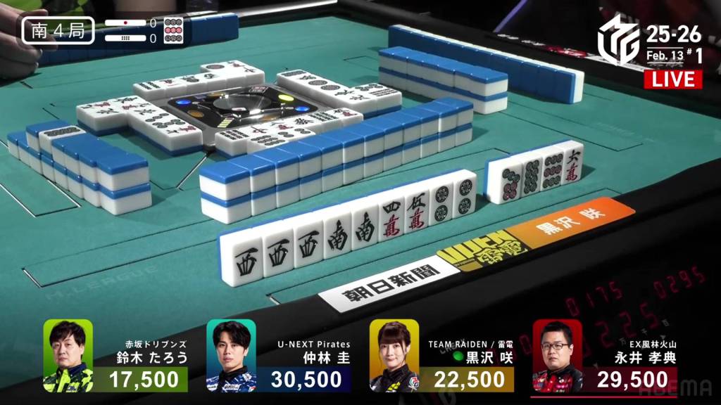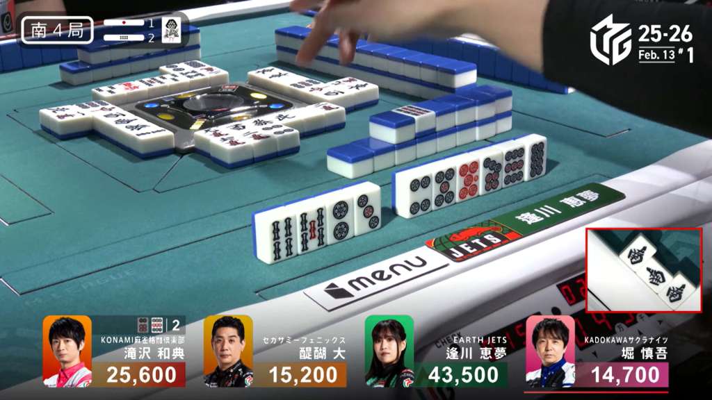 In S4-2, Takizawa is in 2nd place and is 17,900 behind 1st place Aikawa. With a riichi stick and two honba in the pot, Takizawa needs a mangan direct hit, a baiman tsumo or a sanbaiman ron to take 1st place. A difficult task, but not impossible.