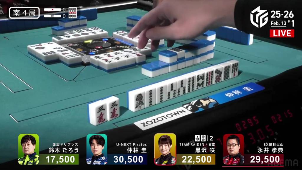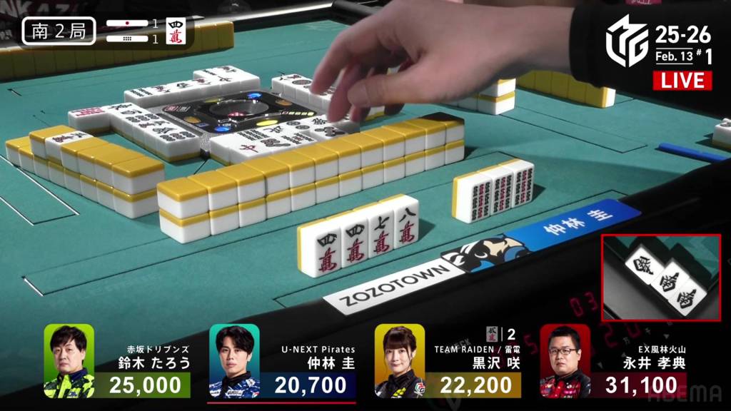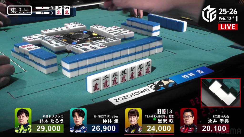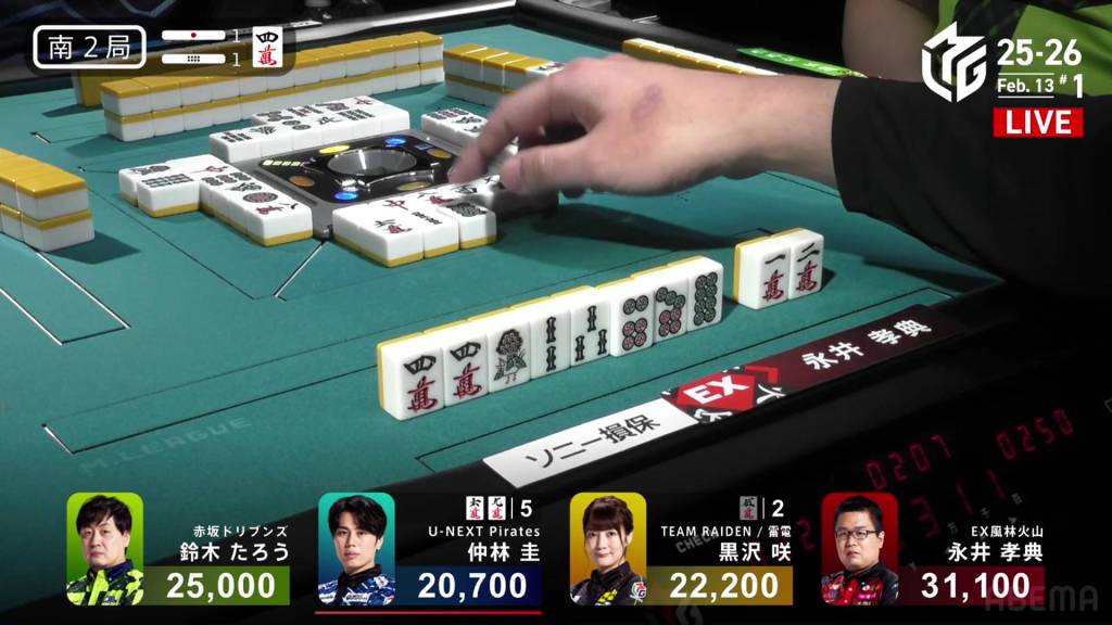 On Nagai’s next turn, he pairs up the 4m to get to iishanten. As Nagai breaks his south pair, Nakabayashi calls pon on the south and gets to tenpai on a 6m kanchan.