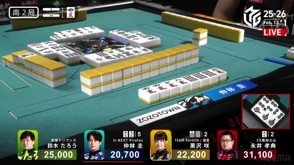 In S2-1, Nakabayashi is the dealer in 4th place, but is within 10,400 from the top spot. A riichi stick and a honba sit in the pot.