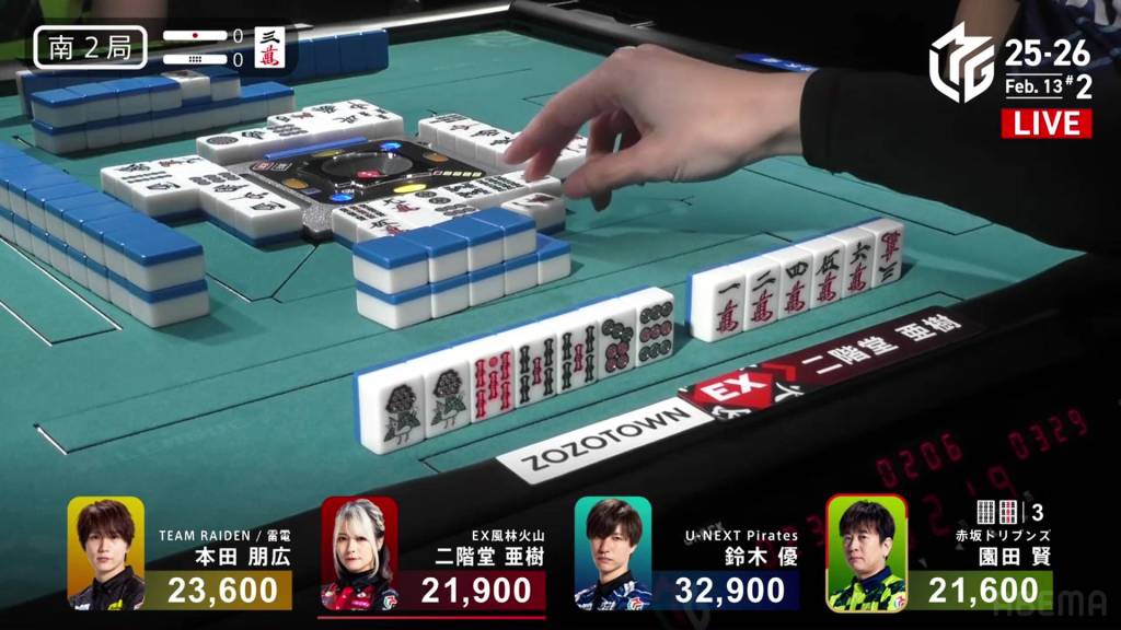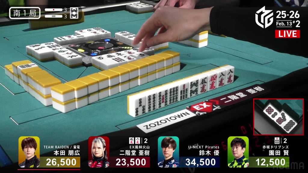 With Sonoda’s discarded red dragon, Yu calls pon to get to iishanten. Right after, Sonoda discards the 9m dora, allowing Yu to call pon and gets to tenpai on a 36m ryanmen, guaranteed a mangan if he wins. After one turn of rest, Sonoda ends up discarding the 3m and deals into Yu. Yu wins the hand with West/Red Dragon/Dora 3 for 8,000 plus two riichi sticks.