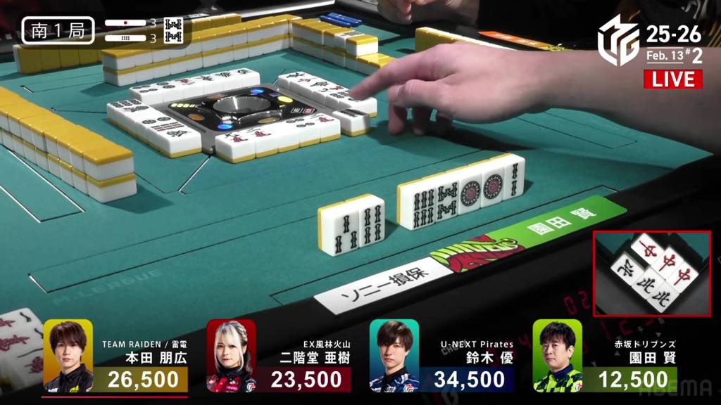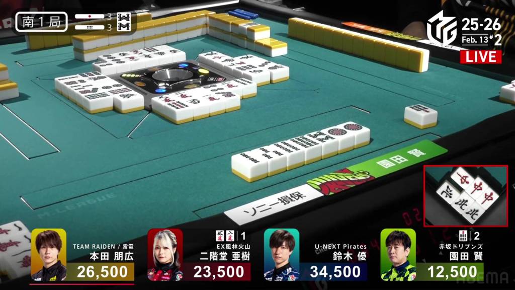 A few turns later, Sonoda draws the 7s and wins the hand. Sonoda wins with North/Red Dragon/Dora 1 for 1,300+300/2,600+300 plus three riichi sticks. Though he is still in 4th place, he gets quite a bit closer.