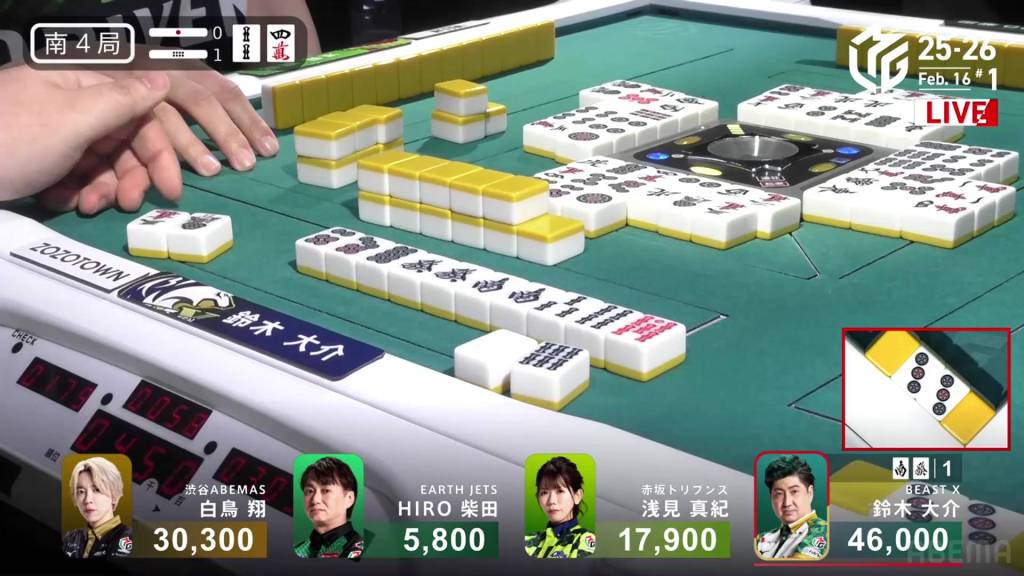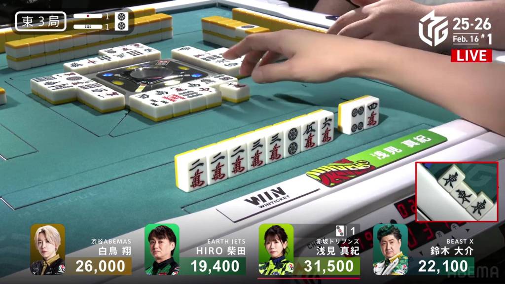 A few turns later, Shibata gets to tenpai on a red dragon tanki, tenpai for shousangen and guaranteed a haneman. Unfortunately, none remain in the wall and Asami won’t relinquish the last one with Shibata’s two dragon calls.